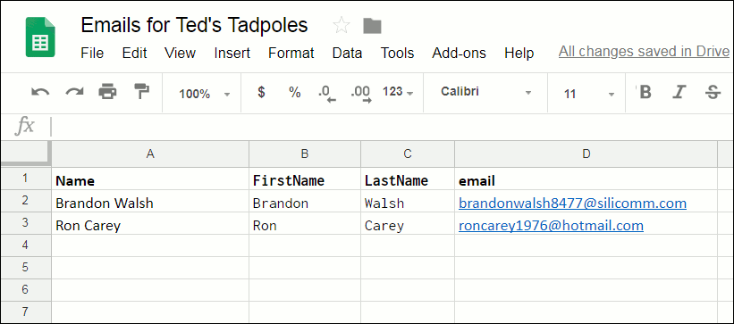 Make sure you have a Google Sheet created to hold your mailing list. For the purposes of this tutorial, the format I will use has just four columns: Name, FirstName, LastName, and email. To follow along, set your spreadsheet up in this way. I also have 2 rows of sample data in it already.