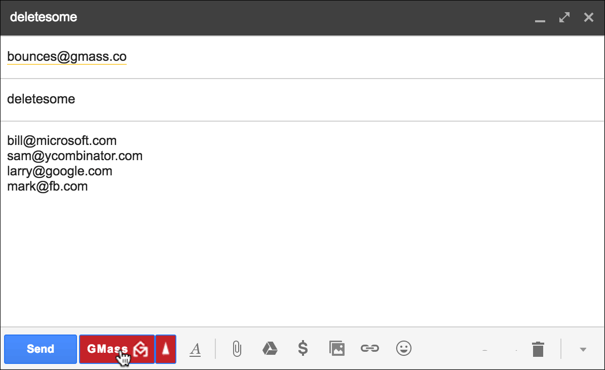 By default, addresses that bounce, where the bounce message indicates a legitimately bad email address, are placed on an internal “bounce list” for your account. And future GMass campaigns are suppressed against your account’s bounce list to prevent you from sending future emails to addresses that have bounced in the past.