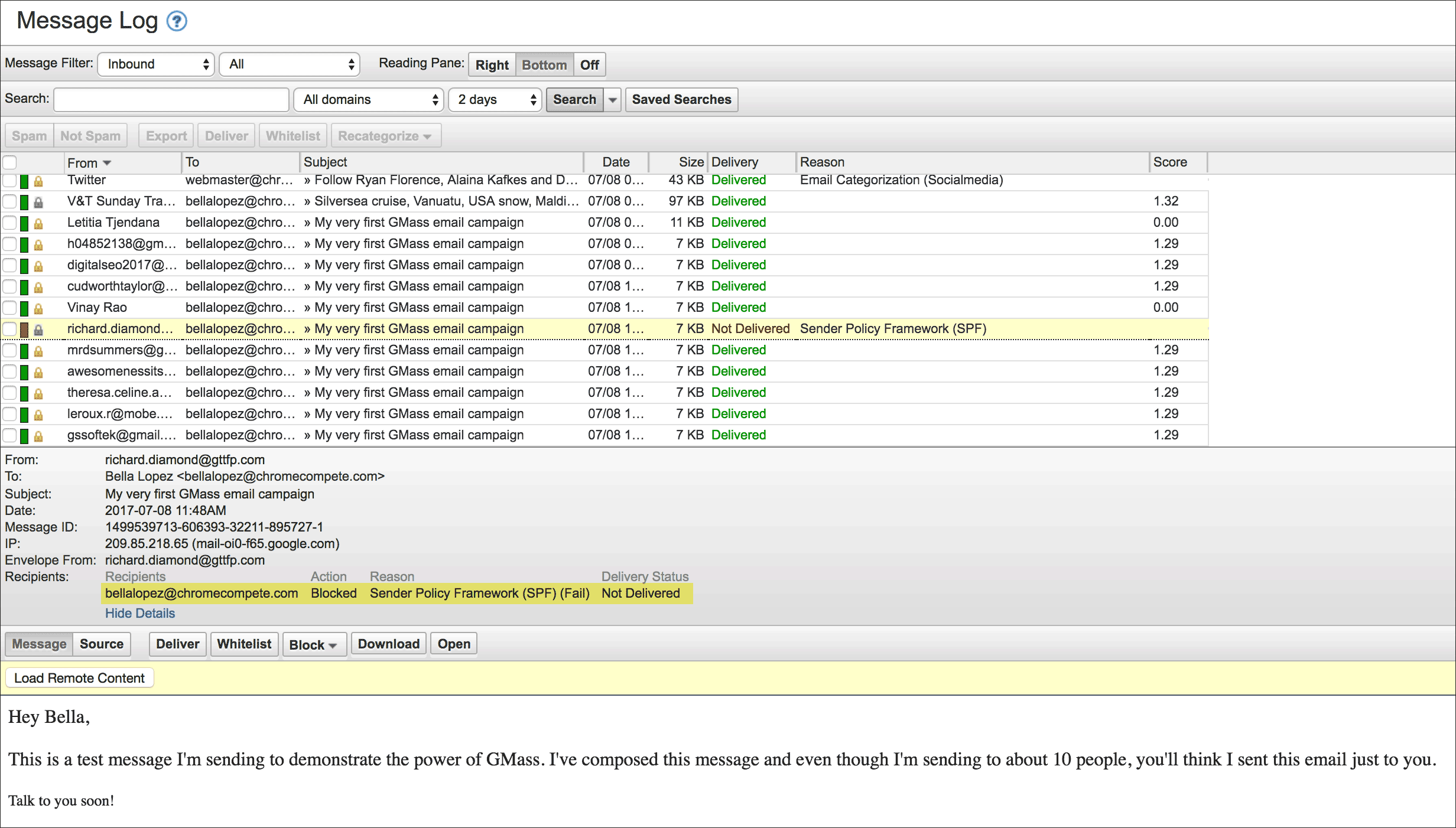 Over time, I’ve built an array of tools to help our Support Team diagnose where a user’s emails are landing, the Inbox or Spam folder. When a user contacts us with a suspected deliverability issue, we first analyze the account and look at the open rates of the most recent campaigns. Some users have open rates of greater than 50%, and if we see that, we can usually conclude that there isn’t a widespread deliverability problem. If the open rate is lower, or we want to be thorough, then we conduct a seed list test. We have a simple way of taking any campaign in your GMass account and sending it from your Gmail account to several “seed list” addresses that we maintain. This list of about ten secret addresses are addresses across multiple email providers and email filtering systems, and they include at least one address in each of the following systems: