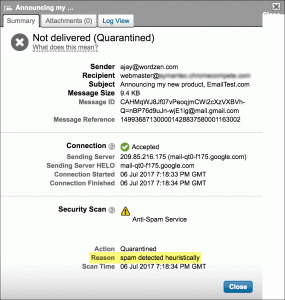 Inside the Barracuda control panel, I can highlight any message that’s been blocked by a Barracuda filter, and Barracuda will state why it’s been blocked, and even better, they’ll tell you if it was a particular domain that caused the block.