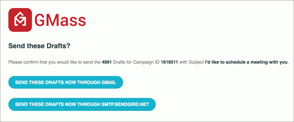 If, however, you have linked an SMTP service to your GMass account, you may want all the Drafts created now, so that you can send all the Drafts now via the SMTP service.