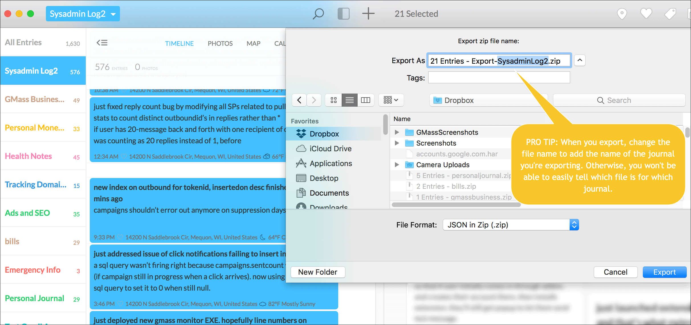 If you go to File –> Import/Export, that will export an entire journal. I wanted to export select entries, namely the ones after July 2018. Do don’t go to the File Menu. Instead, just highlight the entries you want to export (select them with CMD+A on Mac or CTRL+A on Windows), and then Right Click –> Export. This is detailed here in the official Day One support article on exporting. You’ll get a few export file options. I like JSON because I know it’ll preserve everything, and because I’m partial to JSON since that’s the format GMass uses to communicates with Gmail.