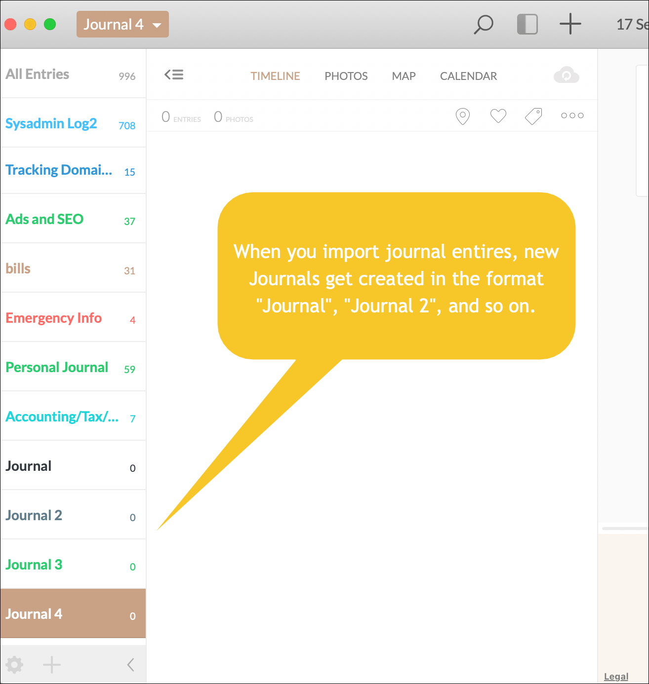 When you import entries, they get imported as new Journals. In this screenshot, I’ve already dragged the entries from the imported Journals into the Journals in which they belong. That’s why the imported Journals show 0 entries.