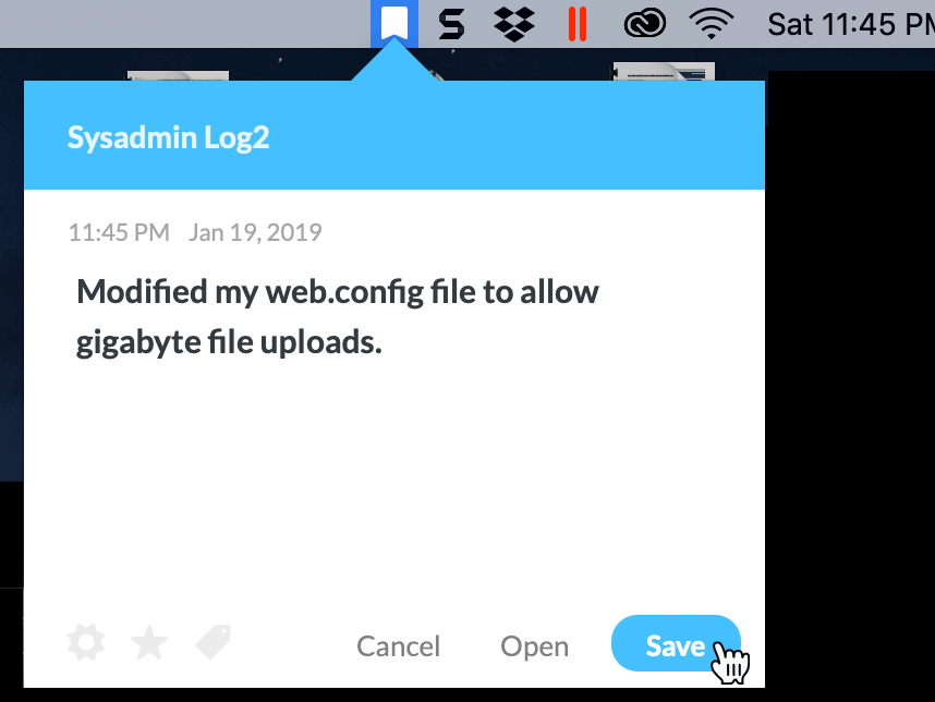 I did, however, find a journaling app called Day One that is meant for personal journaling but I’ve found that it works well for my sysadmin needs. The key feature that makes it better than using Notes, Notepad, Google Docs, Word, or any other app that lets you type stuff, is that its little icon sits in the Mac Menu Bar so that adding a new entry is as easy as clicking the icon, typing your stuff, and hitting a button.