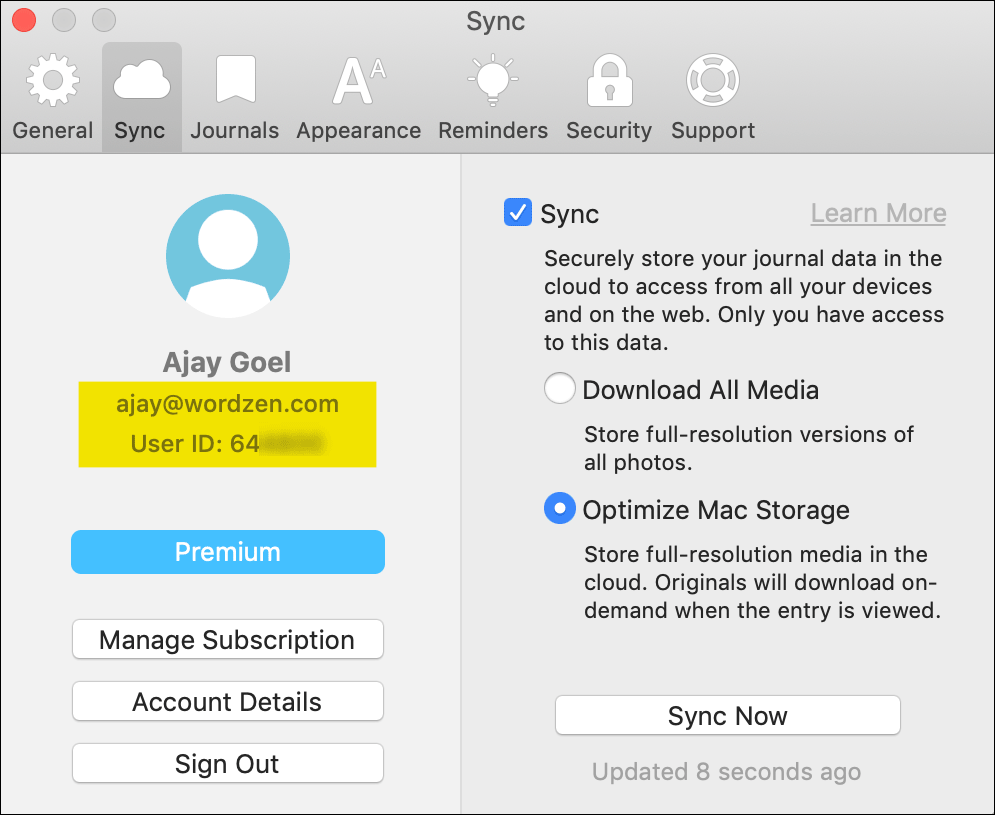 However, when I switched to the subscription service, one of my devices became out-of-sync with the others. I’m not sure why this happened, but I suspect it’s because when I originally purchased Day One, I had done so with my Apple ID of ajay.goel@silicomm.com, and when I purchased the subscription service, my Apple ID had changed to ajay@wordzen.com. The one machine that’s been out of sync with Day One for the last year still showed the user logged in as ajay.goel@silicomm.com. To make matters worse, I had been making new journal entries from all of my various devices, including the out-of-sync computer. This presented the frustrating problem of getting the out-of-sync computer back in sync and making sure that any entries that were on the out-of-sync computer were also on the in-sync devices (before I resolved this, they were not).