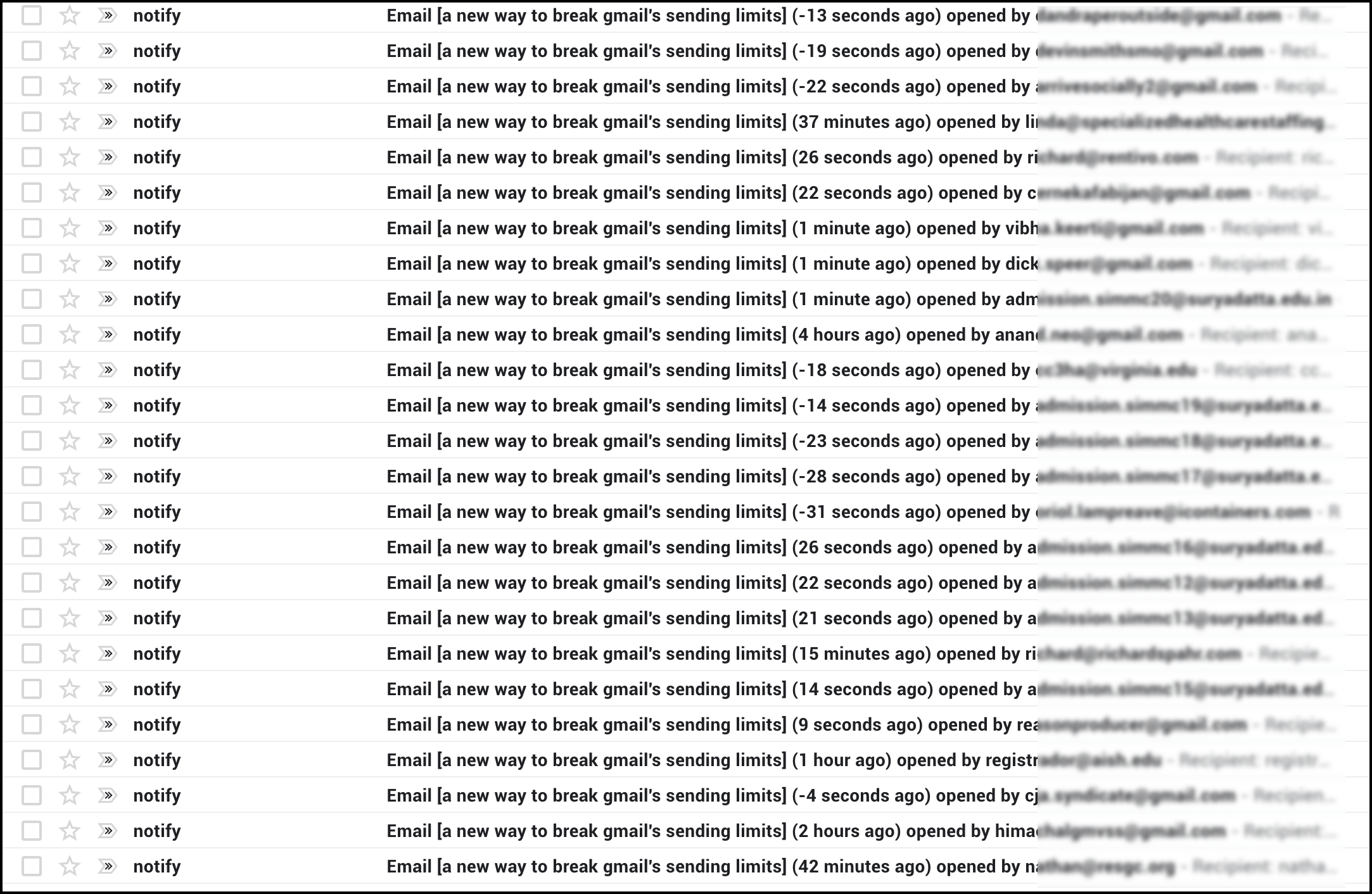 Additionally, opens from this User Agent happen within seconds after sending an email. We recently added a time designation to the “open” notifications that GMass users receive in the GMass Reports –> Opens Label. The Subject line of the notification shows how much time has elapsed between the email sending and the email opening. All of the “false” opens are recorded in mere seconds after the email is sent: