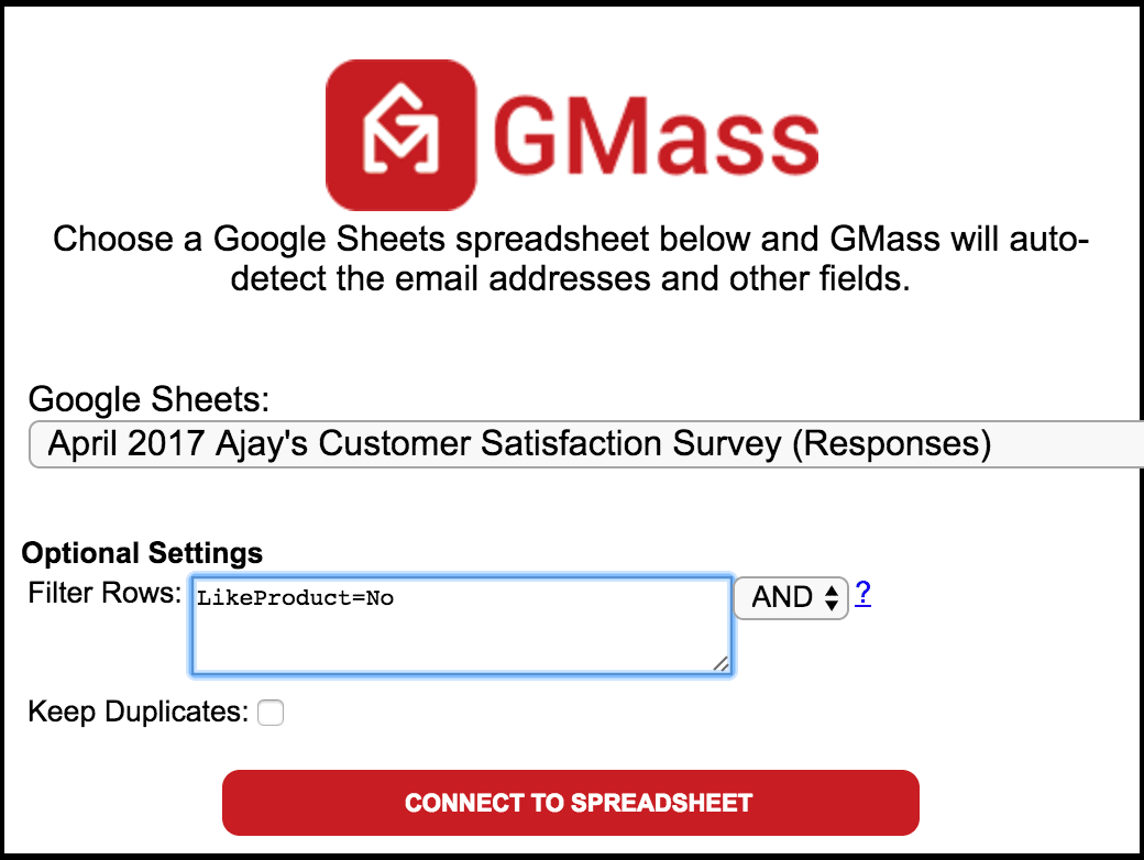 You can now send a new mail merge campaign from the spreadsheet which collected survey responses, selecting only the respondents that answered in a particular way. In this example, we’ll email everyone who said they didn’t like the new product to ask them how it can be better.