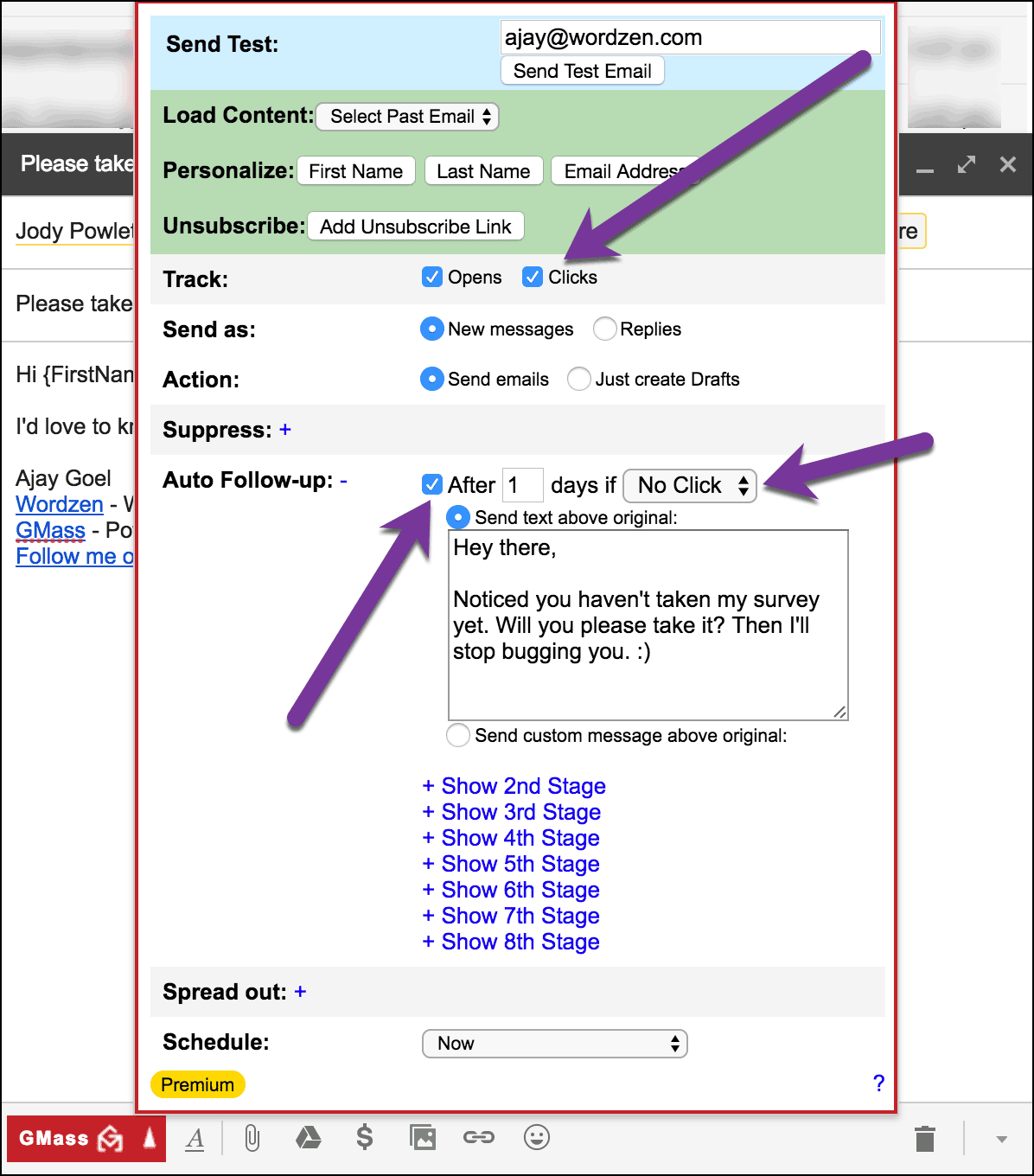 When configuring your auto follow-ups, you will see the No Click option in the drop-down menu for each follow-up Stage. Here you can set a custom reminder to be emailed to prospects who do not click on your survey link within a stipulated period. Optionally you can add Stage 2 and subsequent follow-ups to keep pinging people to take the survey. This is how you maximize the number of people that take your survey. Once you complete this setup, you can send your campaign by hitting the GMass button.