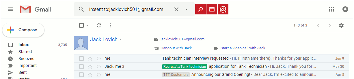 For example, this search, followed by clicking the magnifying glass to the left of the search field, produced these three emails sent to Jack Lovich: