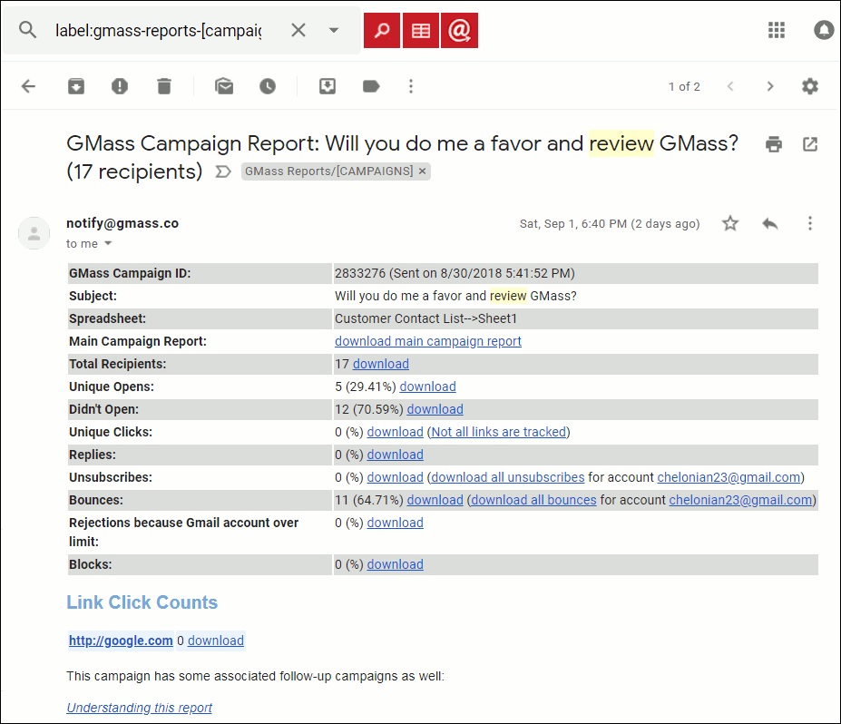Now, if we click on the GMass Campaign Report, you can easily see information about that campaign: