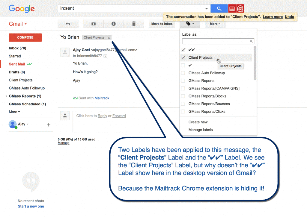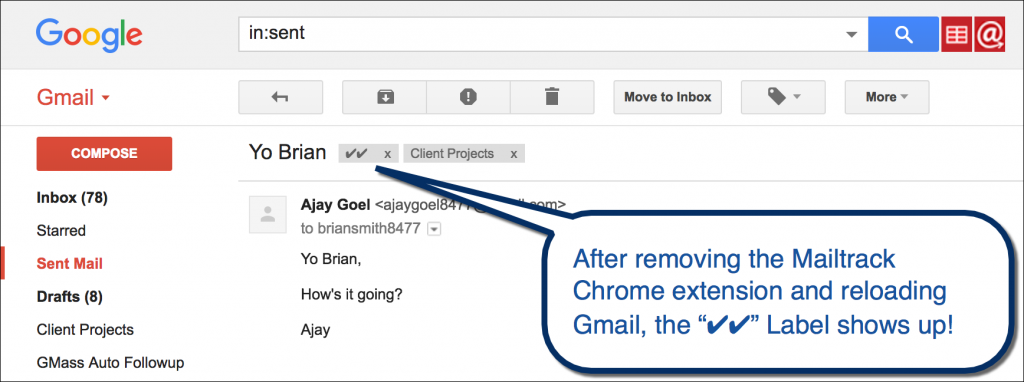 In the example below, you can see the Sent Mail with the “✔✔” Label applied in addition to another Label, “Client Projects”, that I manually applied myself. But only the Client Projects Label shows next to the Subject. Where is the “✔✔” Label?