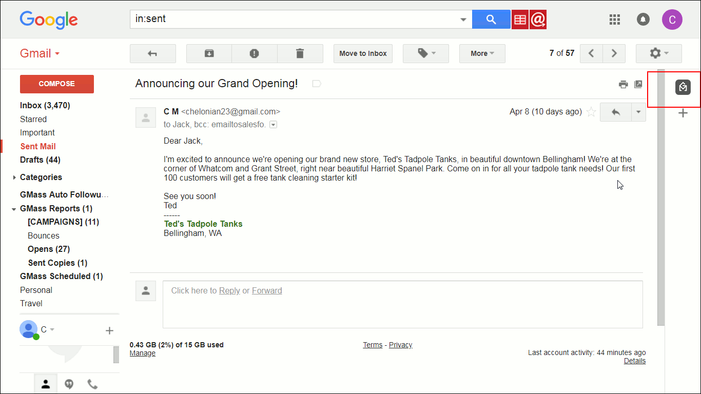 For example, let’s open on an email sent to me from my imaginary customer, Jack Lovich. The email will open as usual, but now click the grey (inactivated) GMass symbol button:
