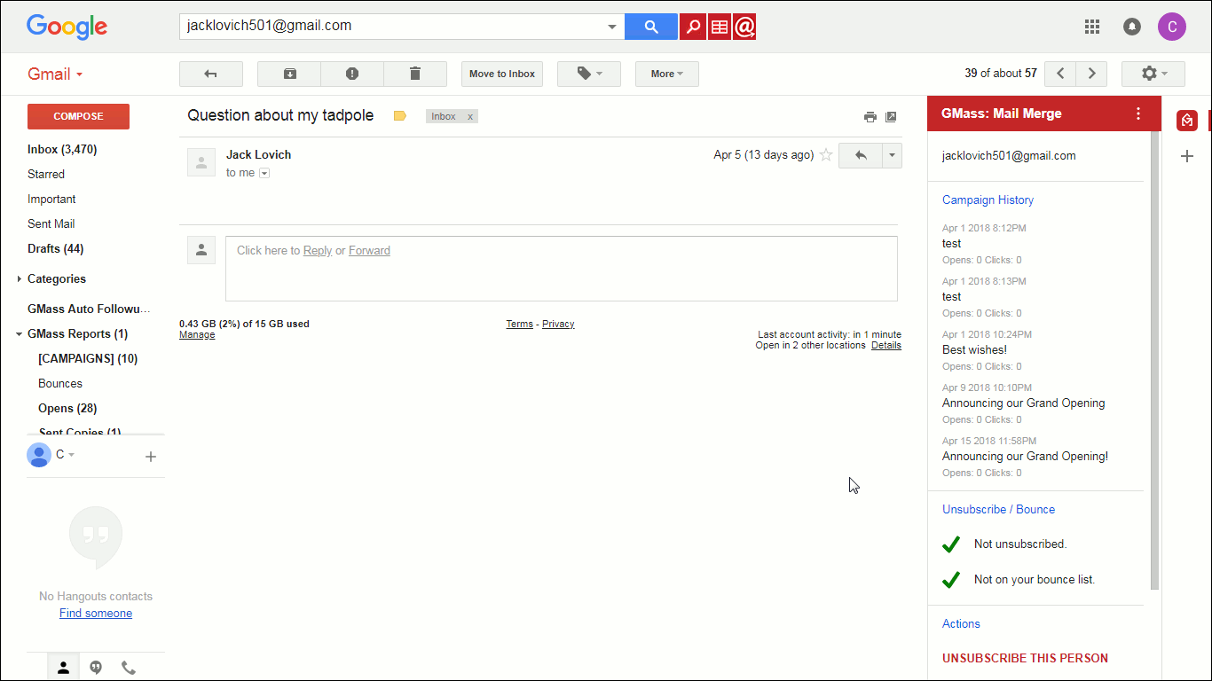 The GMass Gmail Add-on also brings an entirely new feature to Gmail: a recipient’s campaign history window and unsubscribe/bounce status.