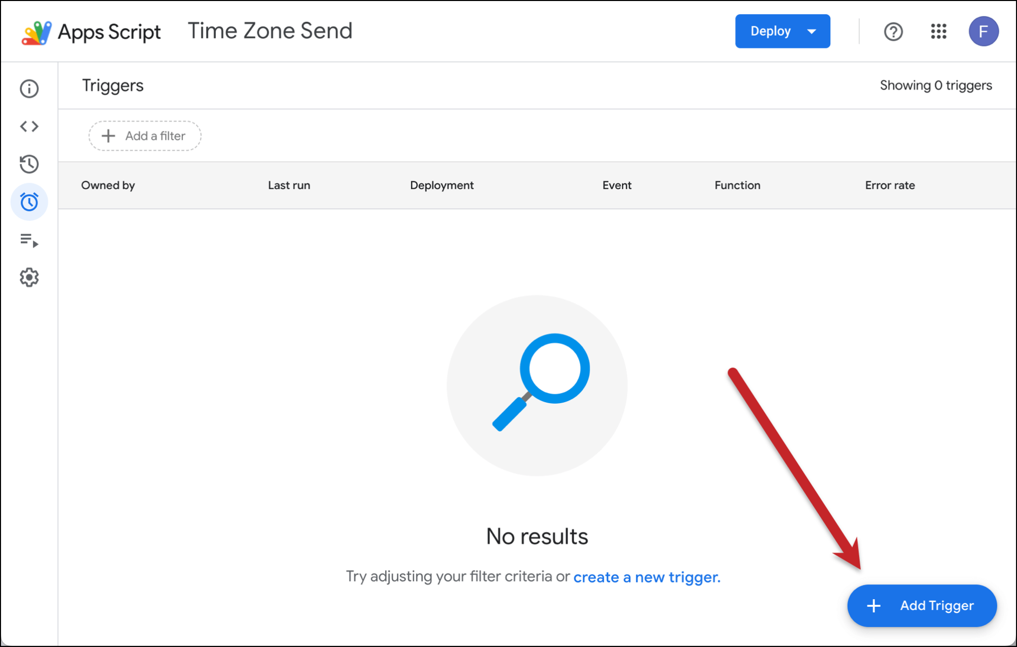 Click on the stopwatch icon on the left sidebar in the Apps Script window to bring up the Triggers menu.