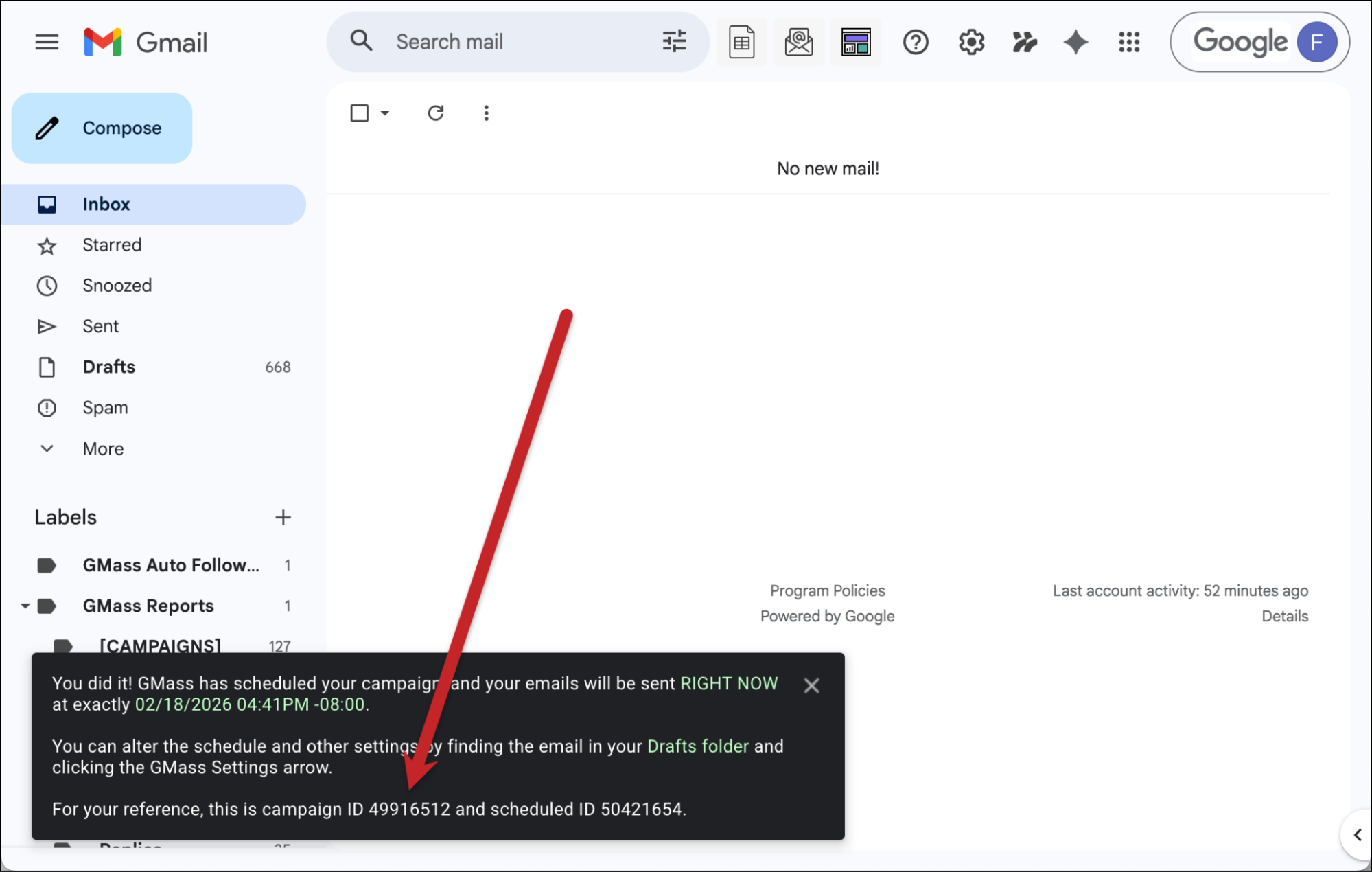 (If you don’t grab the campaign ID from there, you’ll be able to retrieve it in several other places, like the campaign confirmation email GMass sends, the GMass dashboard, or this campaign’s web-based report.)