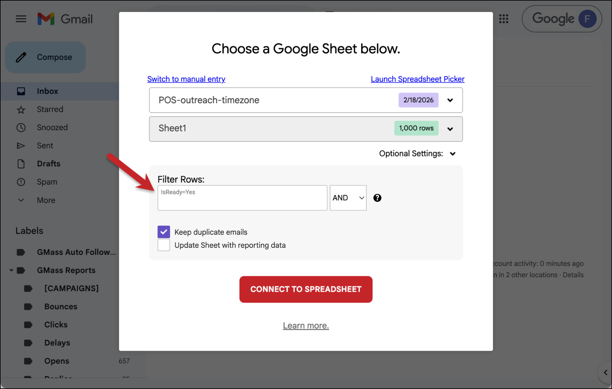 Now we need to add a GMass filter so the campaign only goes out when someone has a “Yes” in the IsReady column.