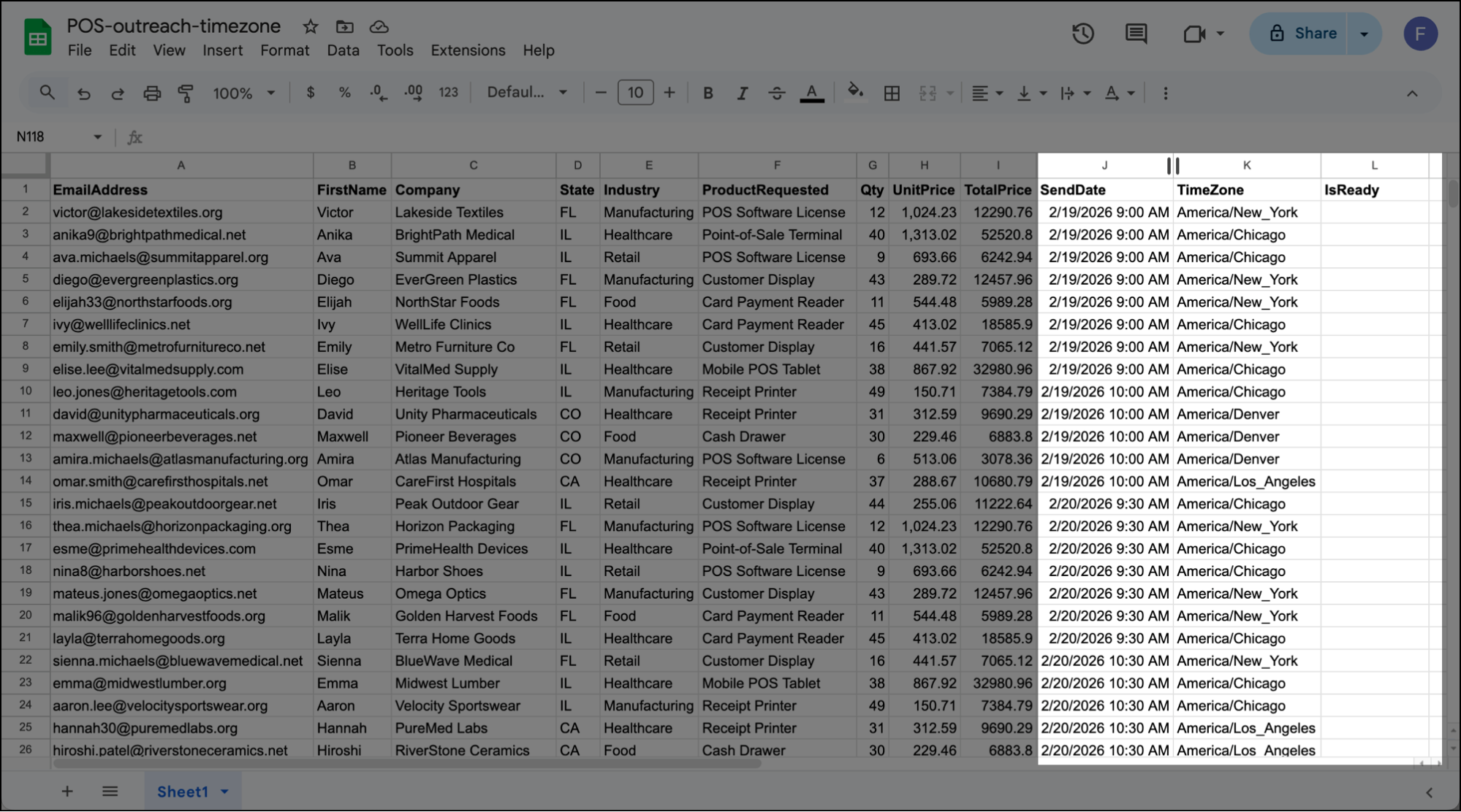 (Yes, even though we set the Google Sheet’s timezone so Sheets is “adding” that timezone to this date/time, our process will eventually strip that out and use the individual time zone you specify in the TimeZone column.)