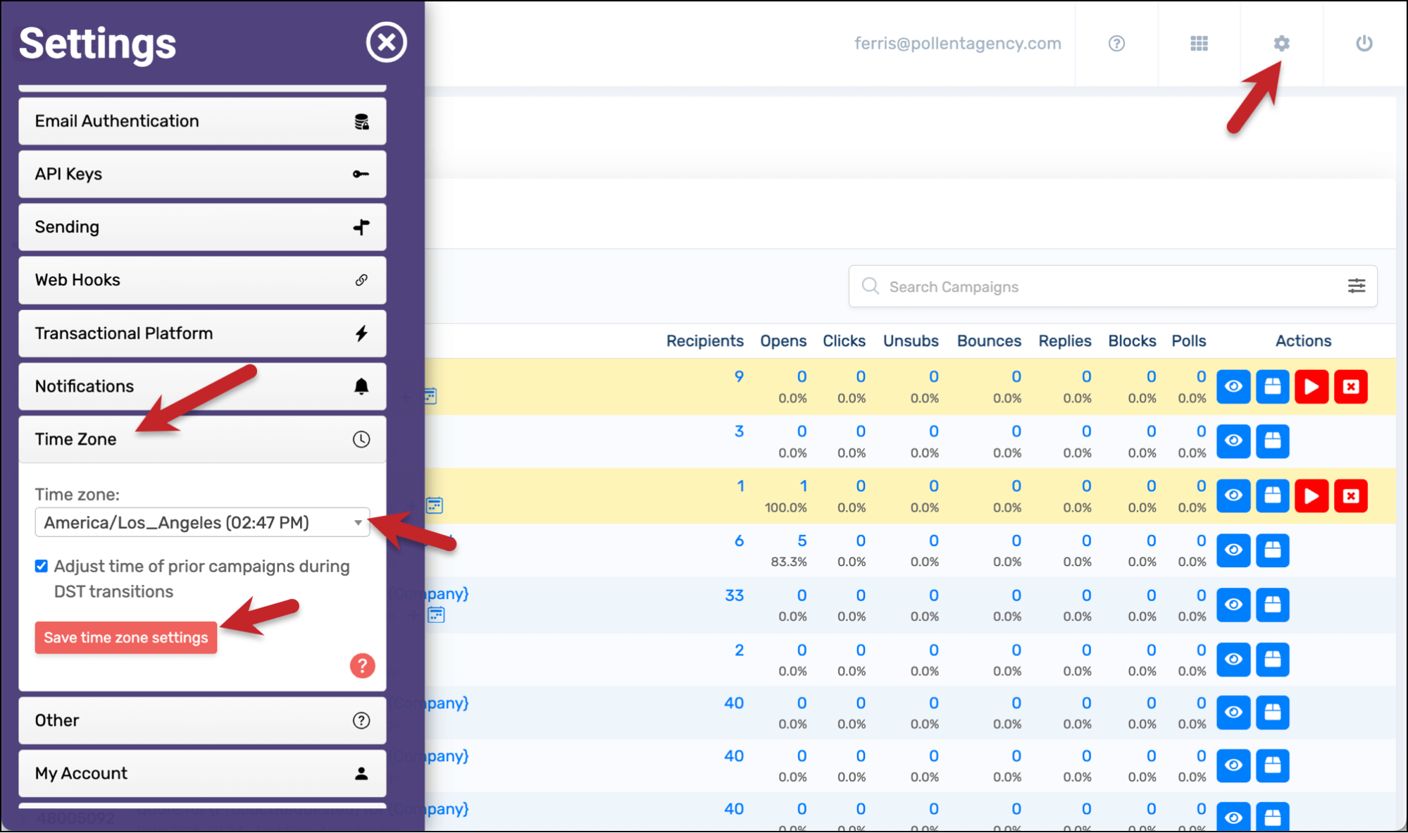Head to your GMass dashboard, open the Settings (that’s the gear icon in the top right), and go to the Time Zone section. Choose your desired base time zone there. (Again, for these examples I’ve picked my personal base timezone of U.S. Pacific. You can pick whatever you want.)