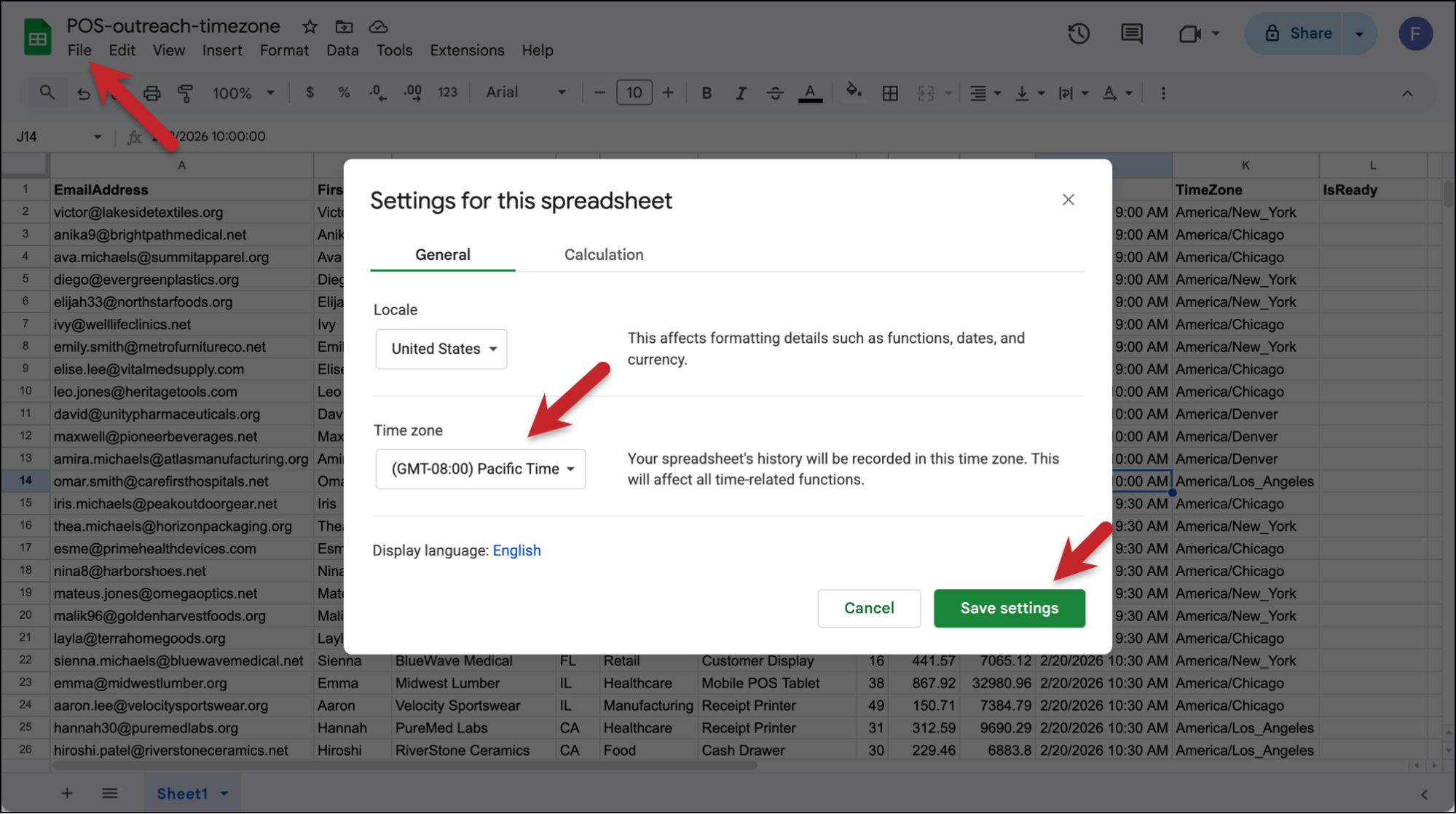 Note: If you leave the TimeZone column blank, it will default to your Google Sheet’s timezone.