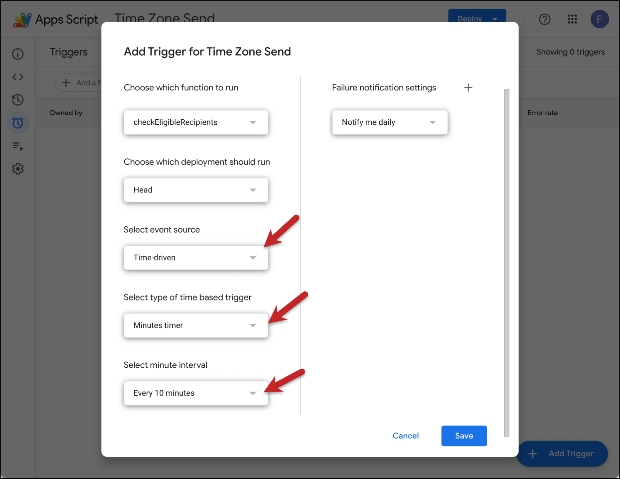 This means the Apps Script will run every 10 minutes looking for the correct time zone. You can go on an even faster increment if you want (like every five minutes, or even every minute).
