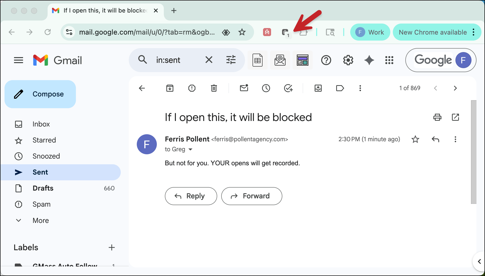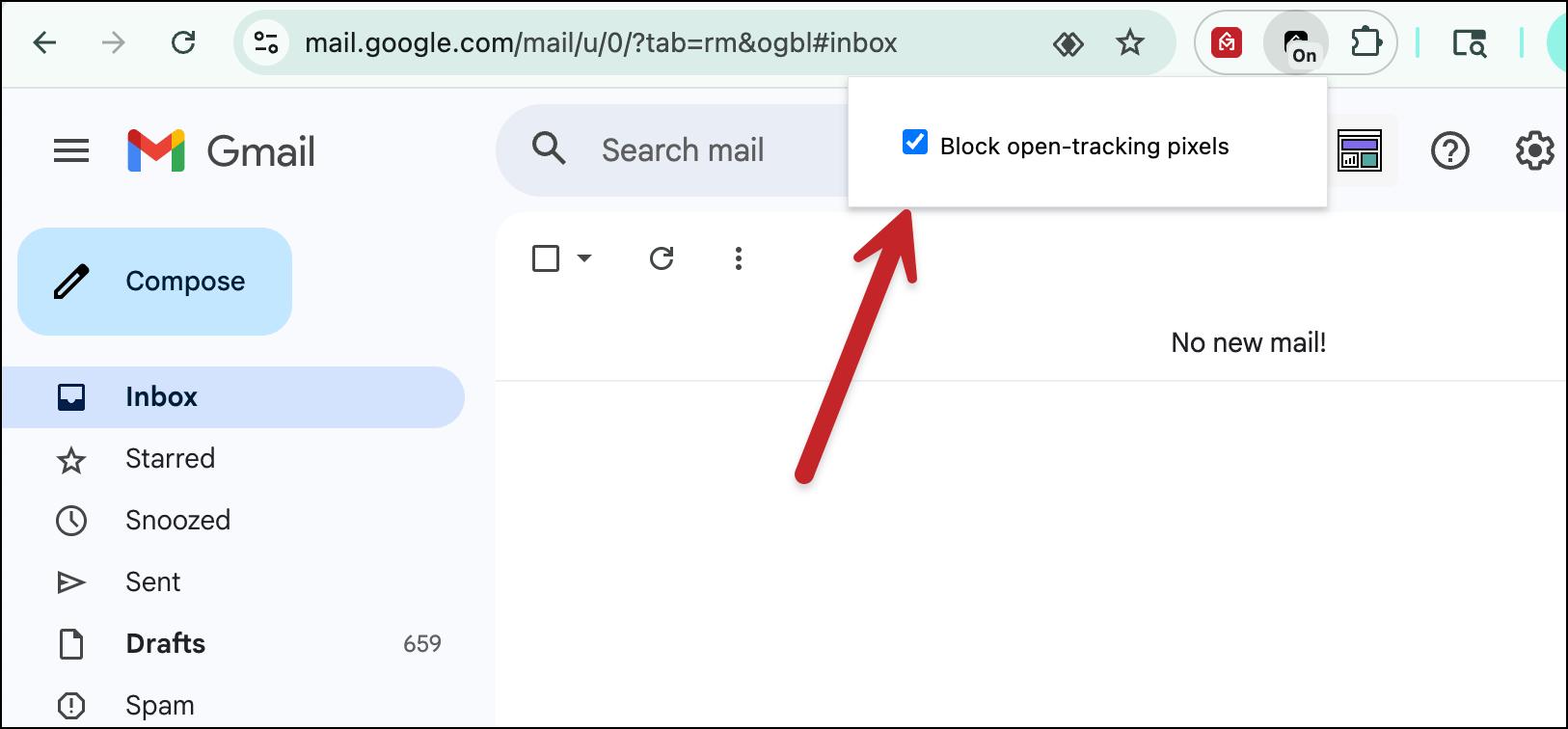 Want to see it working? When Tracker Blocker is on, open a campaign email that has open tracking in your Sent folder. You’ll see a counter on the Tracker Blocker icon increment, showing the pixel was blocked.