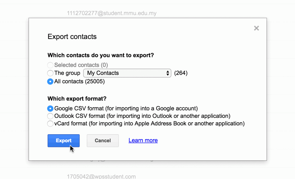 Choose Export and then choose the Contacts you want to export. In my case, I will export all 25,005 contacts: