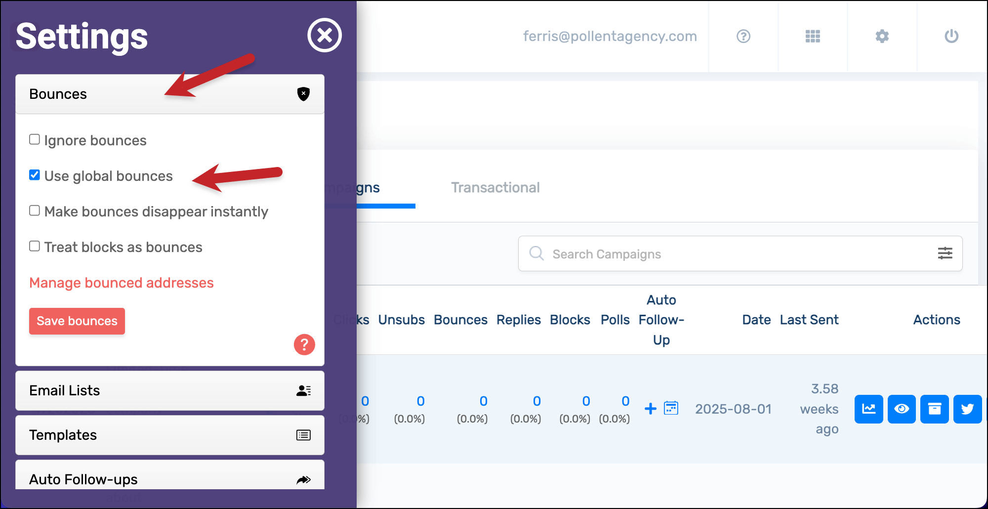 It’s the same process with global bounces. Open the Bounces section of the dashboard and check the box next to Use global bounces.
