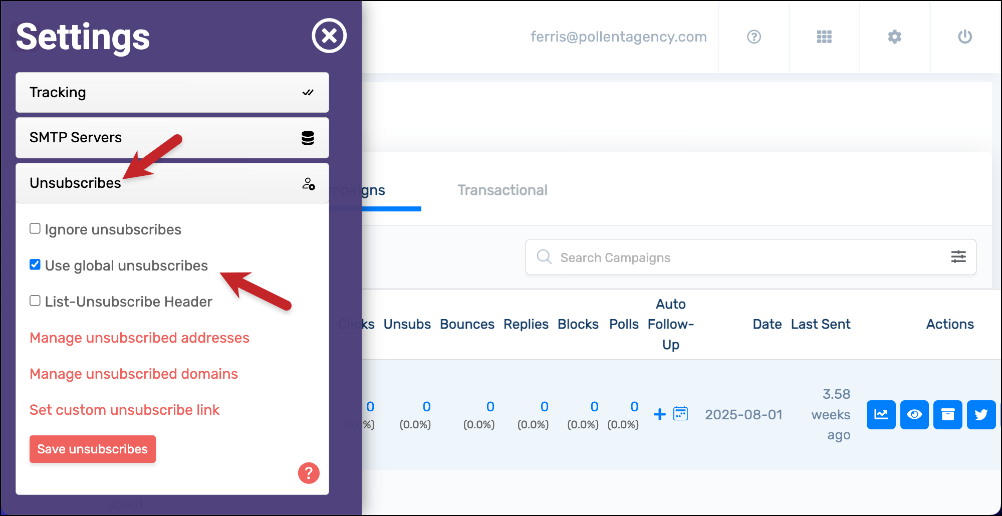To turn on global unsubscribes or global bounces, go to the GMass dashboard. Open the Unsubscribes section of the settings and check the box next to Use global unsubscribes.