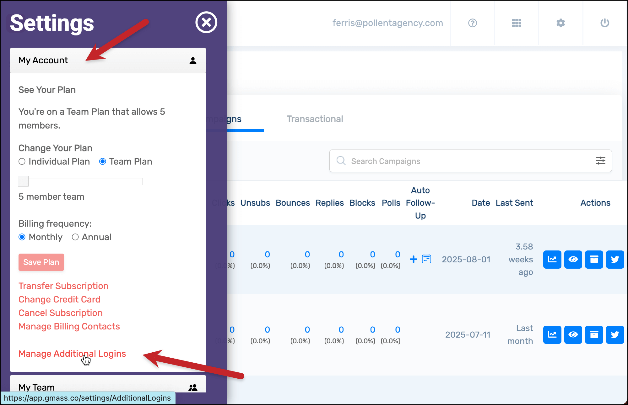 To share your dashboard, go into the GMass dashboard and head to the My Account section. Then click on Manage Additional Logins.