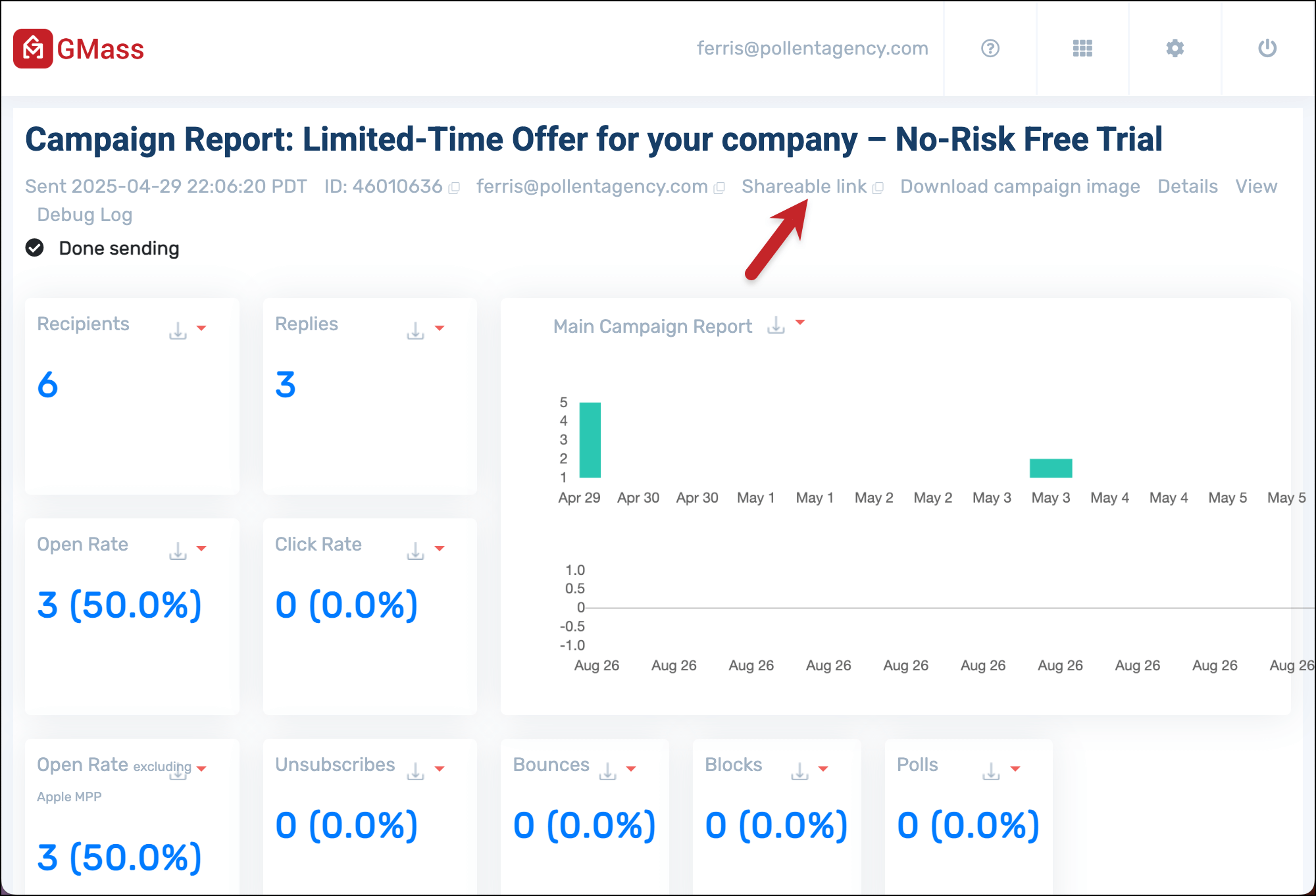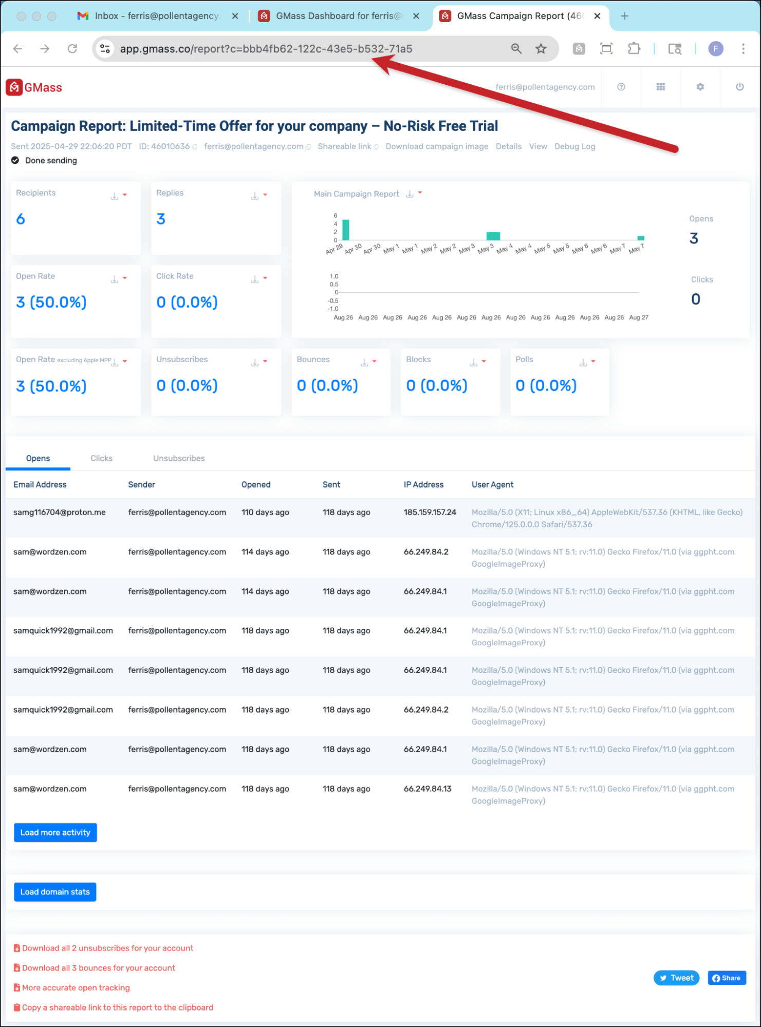 GMass’s web-based campaign report is completely shareable. Anyone with the link to a campaign’s report can view the campaign results in real time.