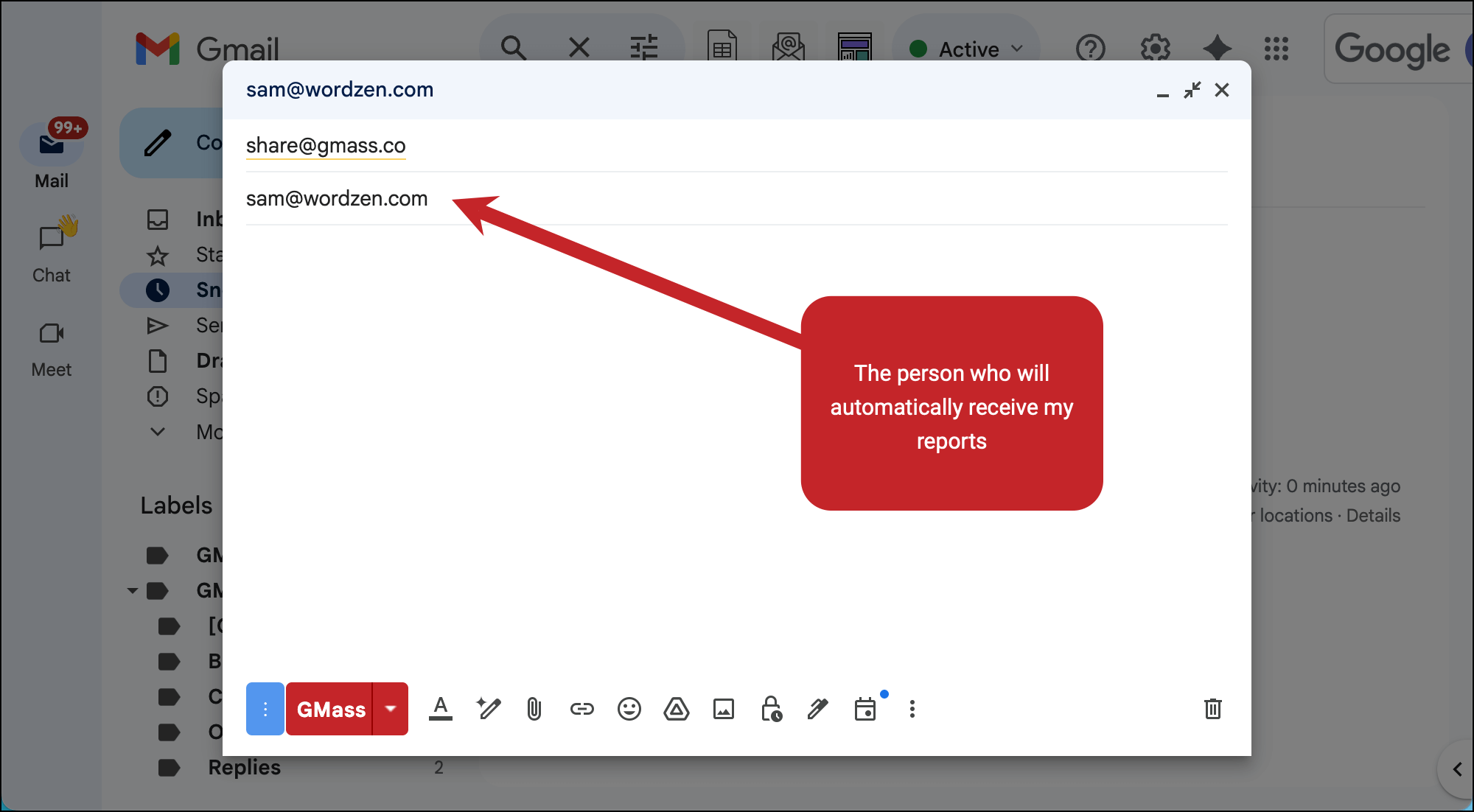 To do so, open a Gmail compose window and type share@gmass.co into the To field. Then, in the subject line, put the email address of the person with whom you want to share all your reports.