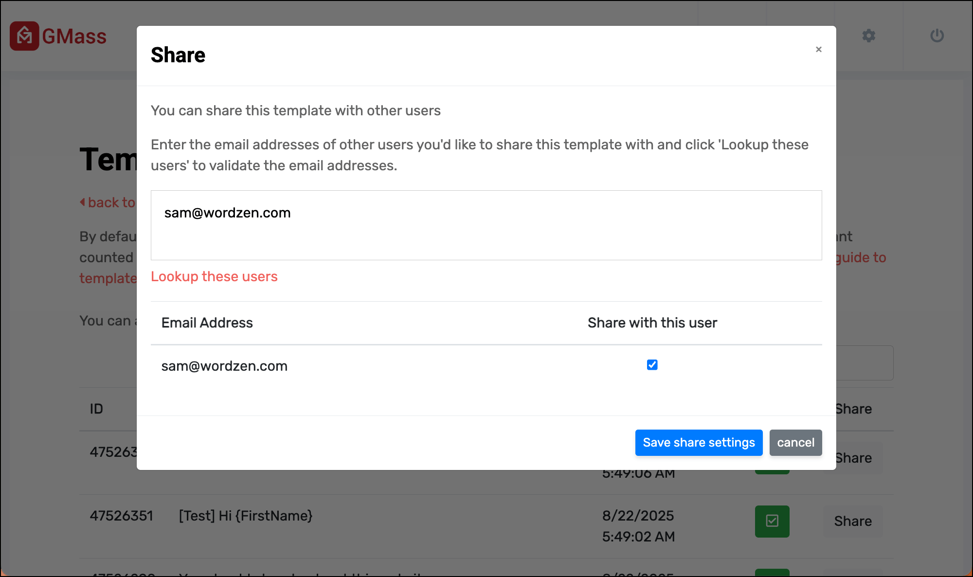 Click Lookup these users. GMass will make sure they have accounts. Make sure the checkbox next to their email is checked, then click Save share settings.
