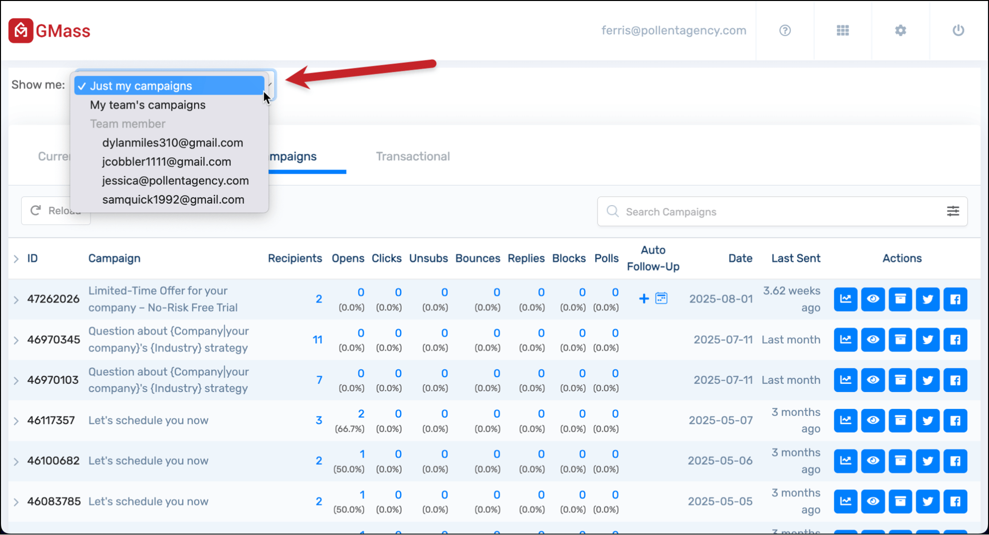From there, you can choose to view your campaigns, all of your team’s campaigns, or an individual team member’s campaigns.