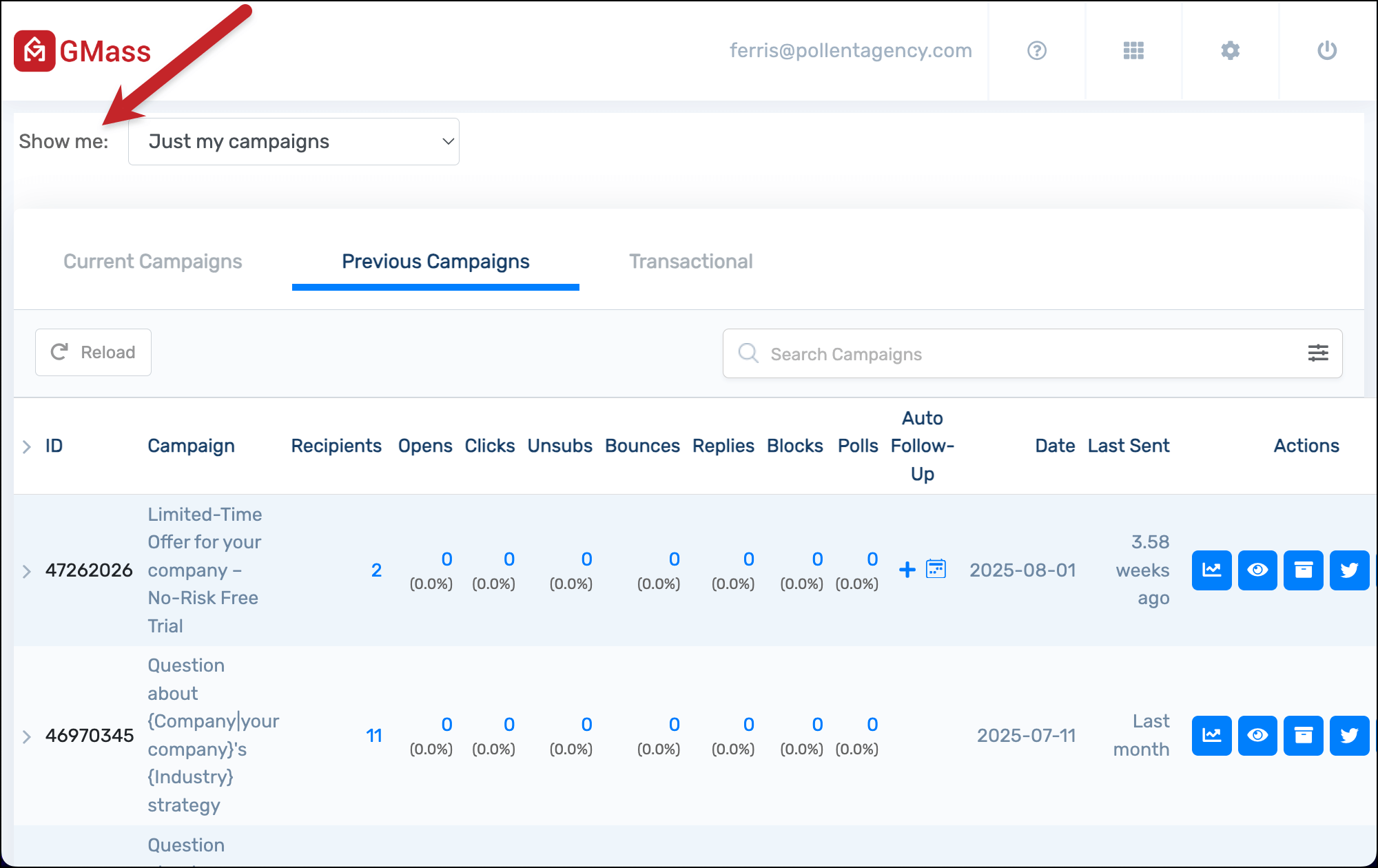 In the main section of the GMass dashboard, where you see various campaigns, look for the dropdown at the top that says Show me.