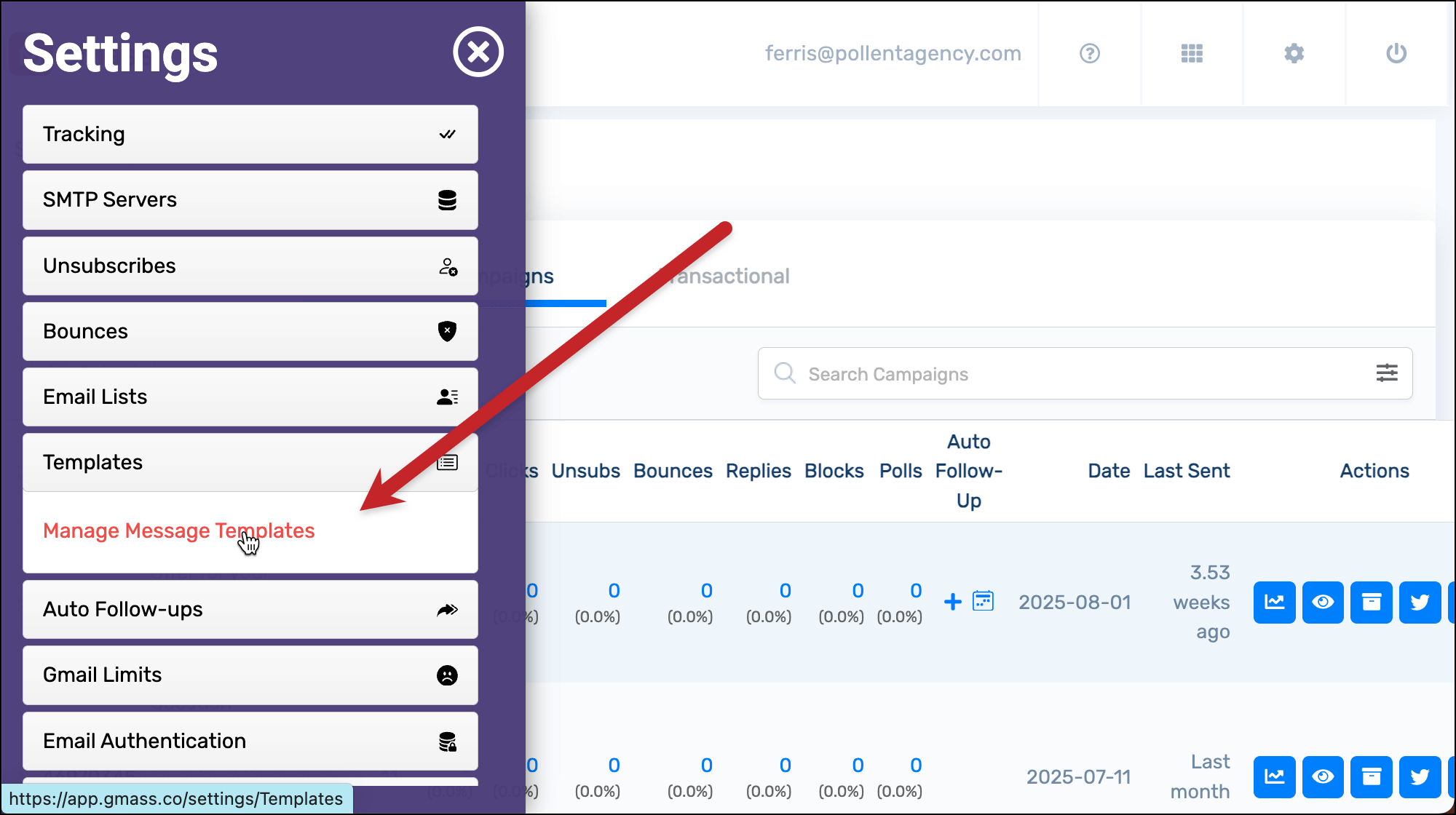 Head to your GMass dashboard, go to the Templates section, and click the Manage Message Templates link.