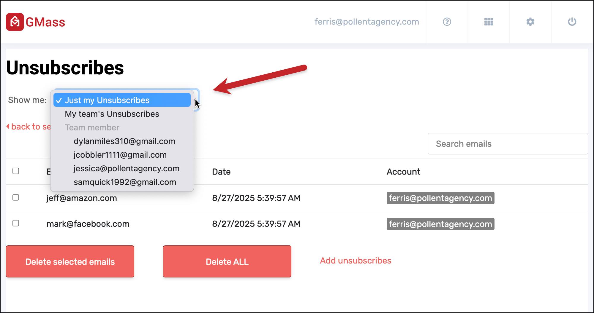 There, you’ll again see the option to view your unsubscribes, everyone on your teams’ unsubscribes, or an individual team member’s list. You can actually manage these lists as well, like making manual additions or removals.