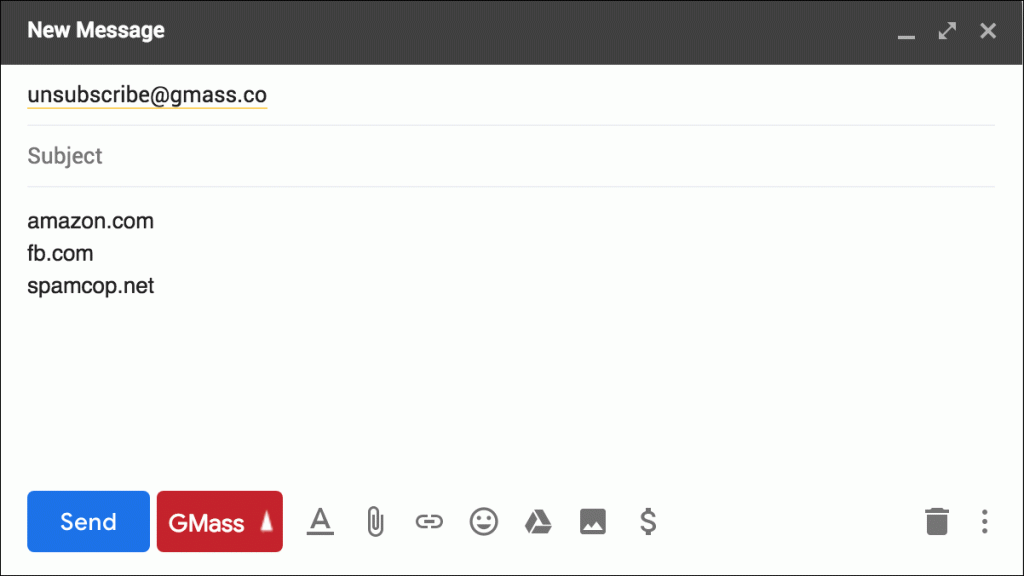 (Note: If you’re a long-time GMass user, you can still use the old method to unsubscribe a domain. Compose an email to unsubscribe@gmass.co, put the domains you want to unsubscribe in the body, then click the GMass button. Those domains will now be unsubscribed.)