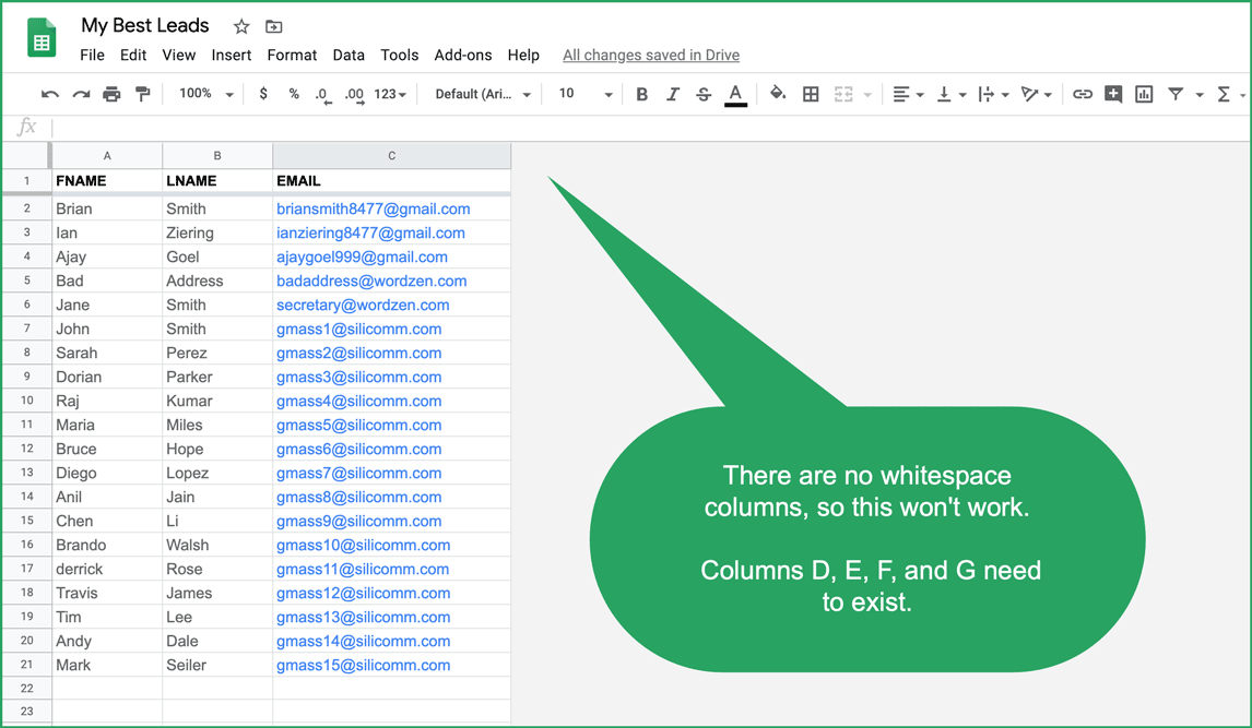 If your Sheet does look like this, just right-click on the right-most column to add a few more columns. You should have at least four empty columns after your last column of data. To future-proof your spreadsheet, in case we add more data to this feature (like “blocks” for example), add even more blank columns. By default, when you first create a new Sheet, columns A-Z exist, giving you a total of 26 columns. Generally, the only reason you would need to eliminate some columns entirely is to reduce the overall size of your Sheet, but that only becomes necessary if you have more than 100,000 rows of data.