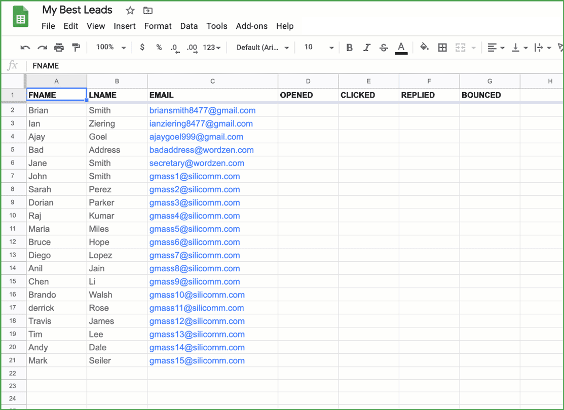 With GMass, you can set your Google Sheet to automatically update as your campaign sends. Opens, clicks, replies, and bounces will update columns in your Google Sheet so that you can easily see how each person has engaged with your mail merge or cold email campaign.