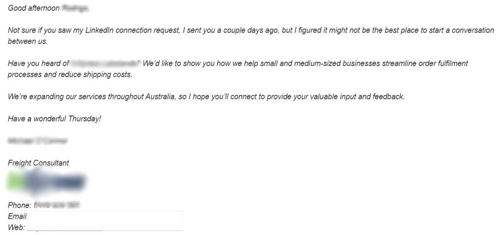 This cold email landed in the inbox of GMass user Rodrigo Garcia-Mulder (we’ve obscured identifying details):
