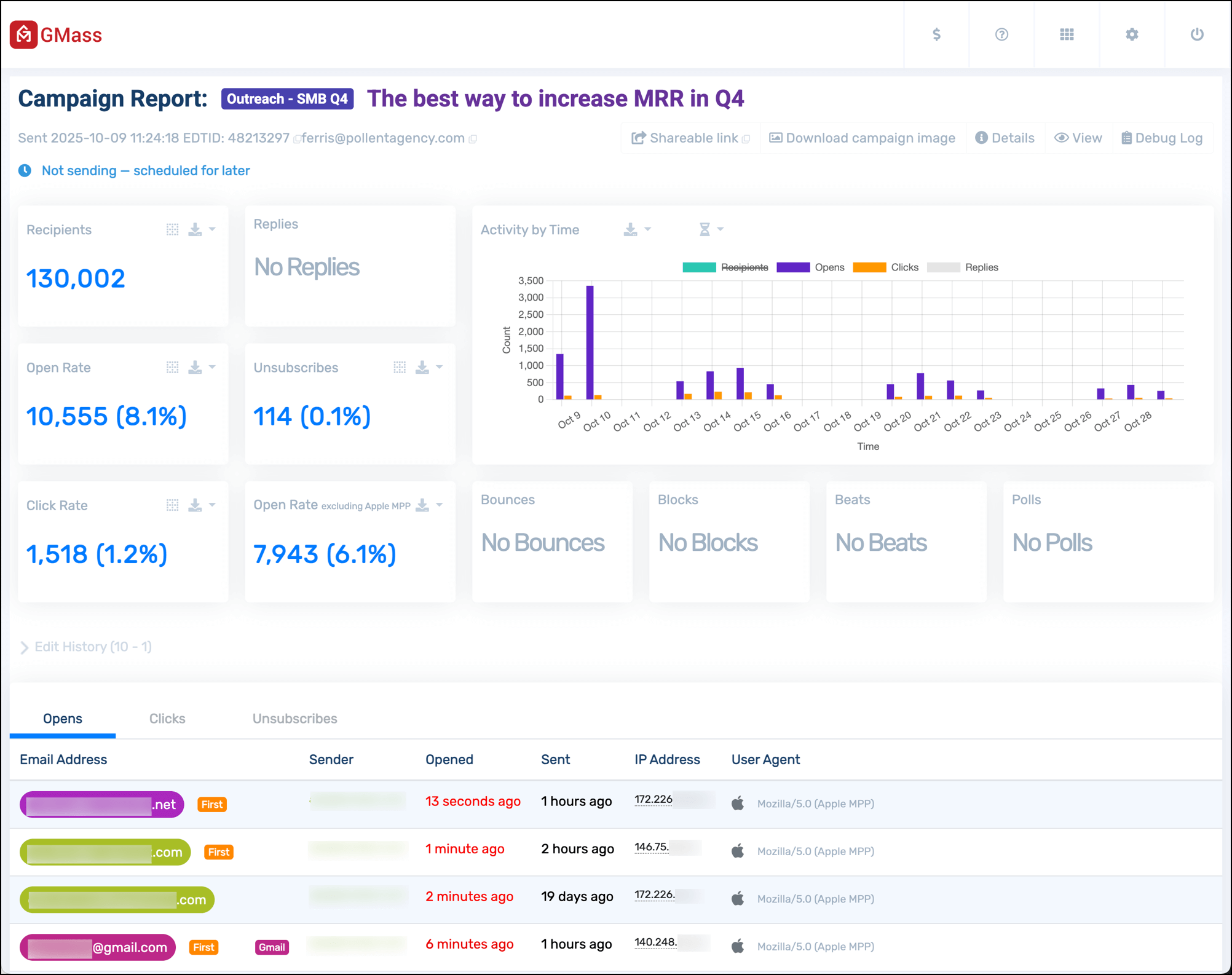 GMass tracks nine different stats for your campaigns: Total recipients, unique opens, didn’t opens, unique clicks, replies, unsubscribes, bounces, rejections due to Gmail sending limits, and emails blocked by spam filters.