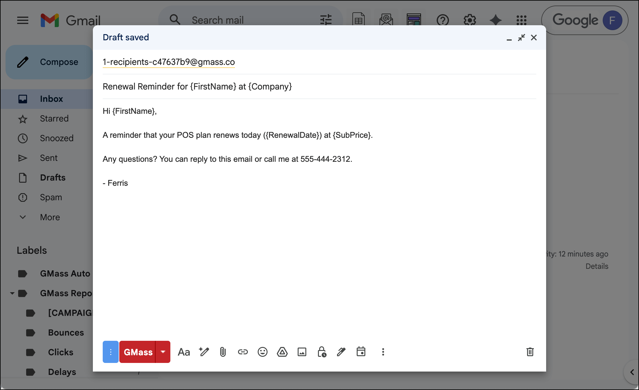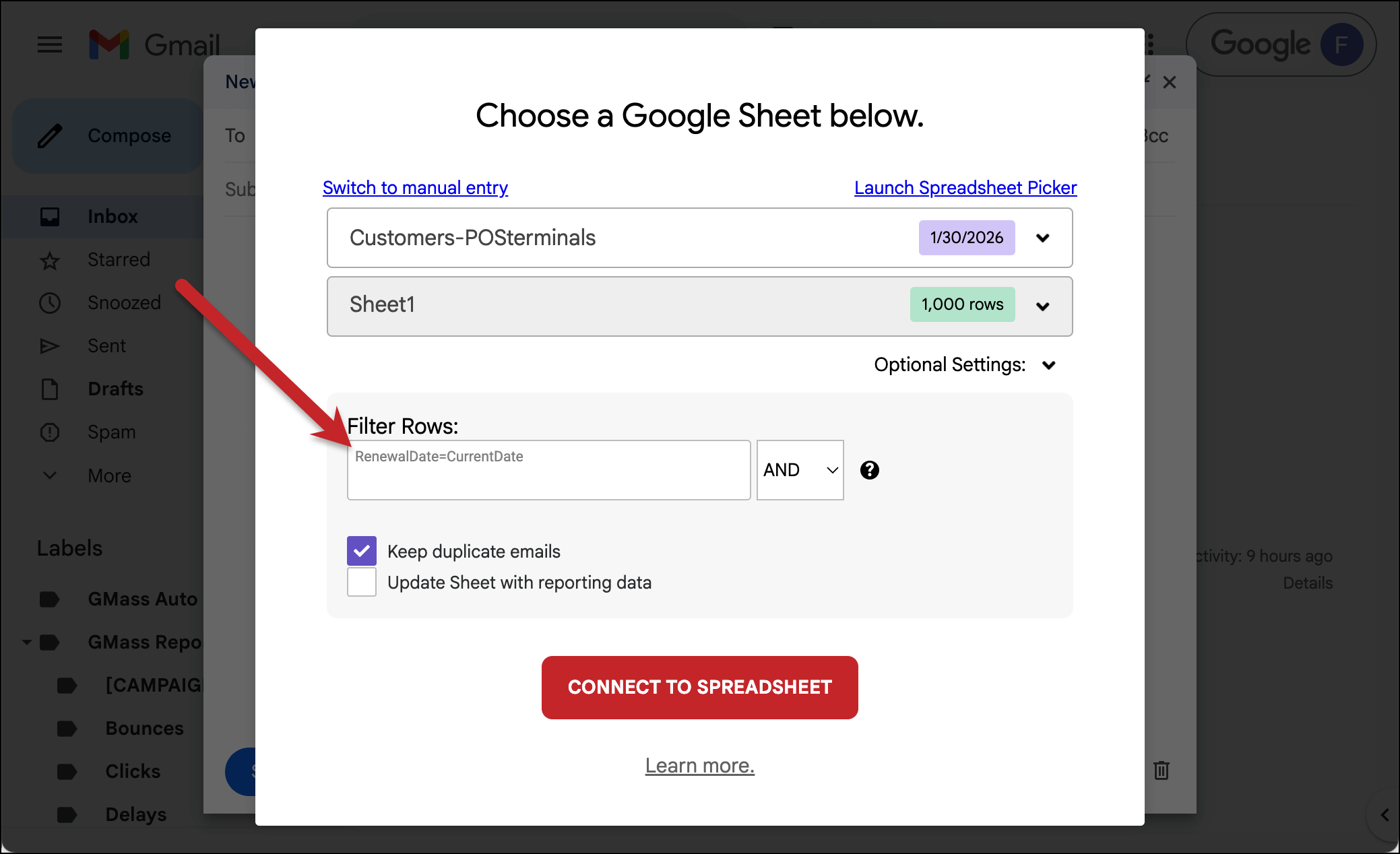We’re going to use a filter here to make sure GMass sends this email to each recipient only on their designated renewal day.