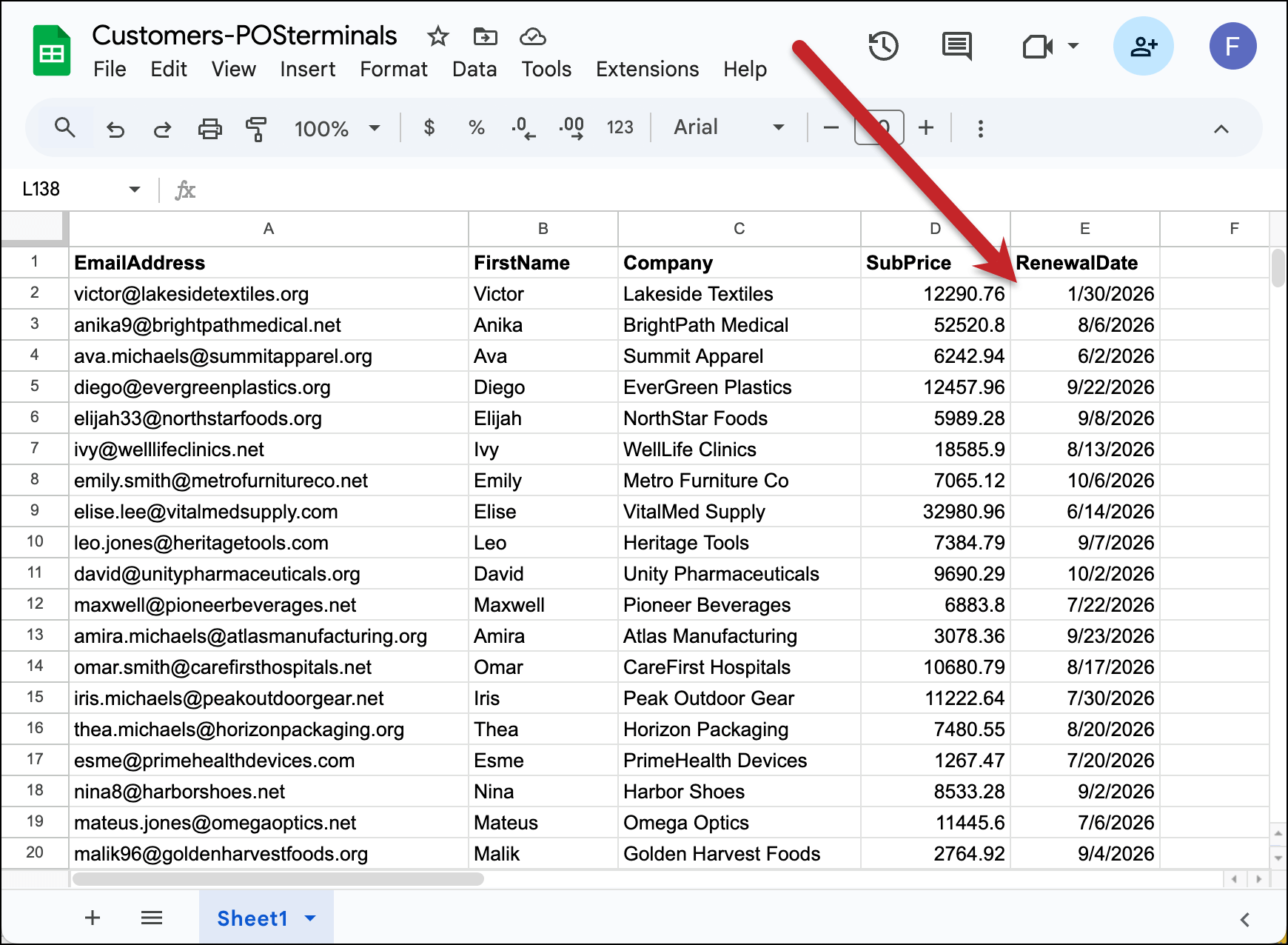In my example, I’ve prepared by Google Sheet and for each customer I have the date I want to remind them about renewing their service.