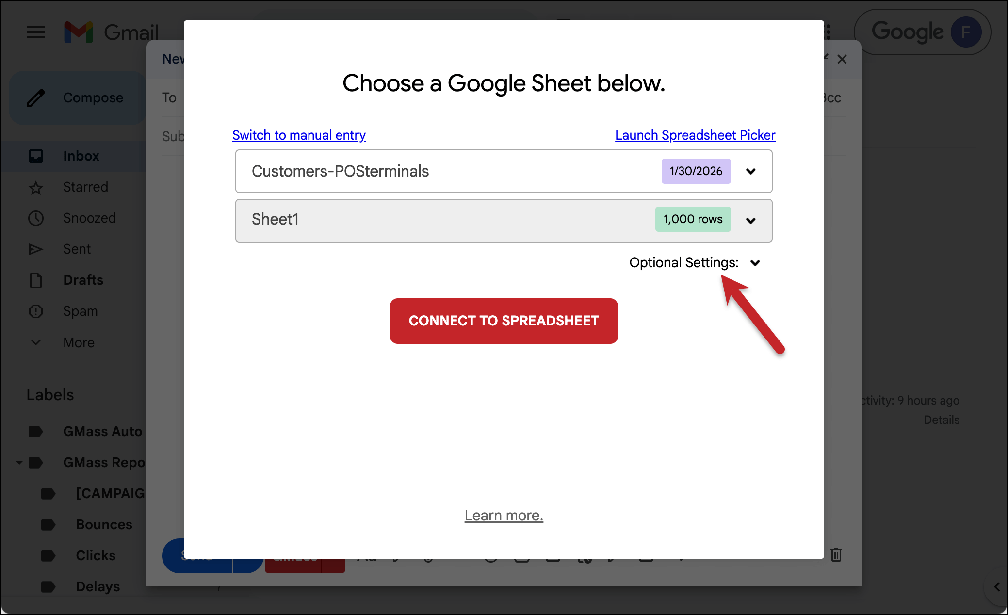 Once the sheet is ready, head to Gmail and connect the Google Sheet to a new campaign.