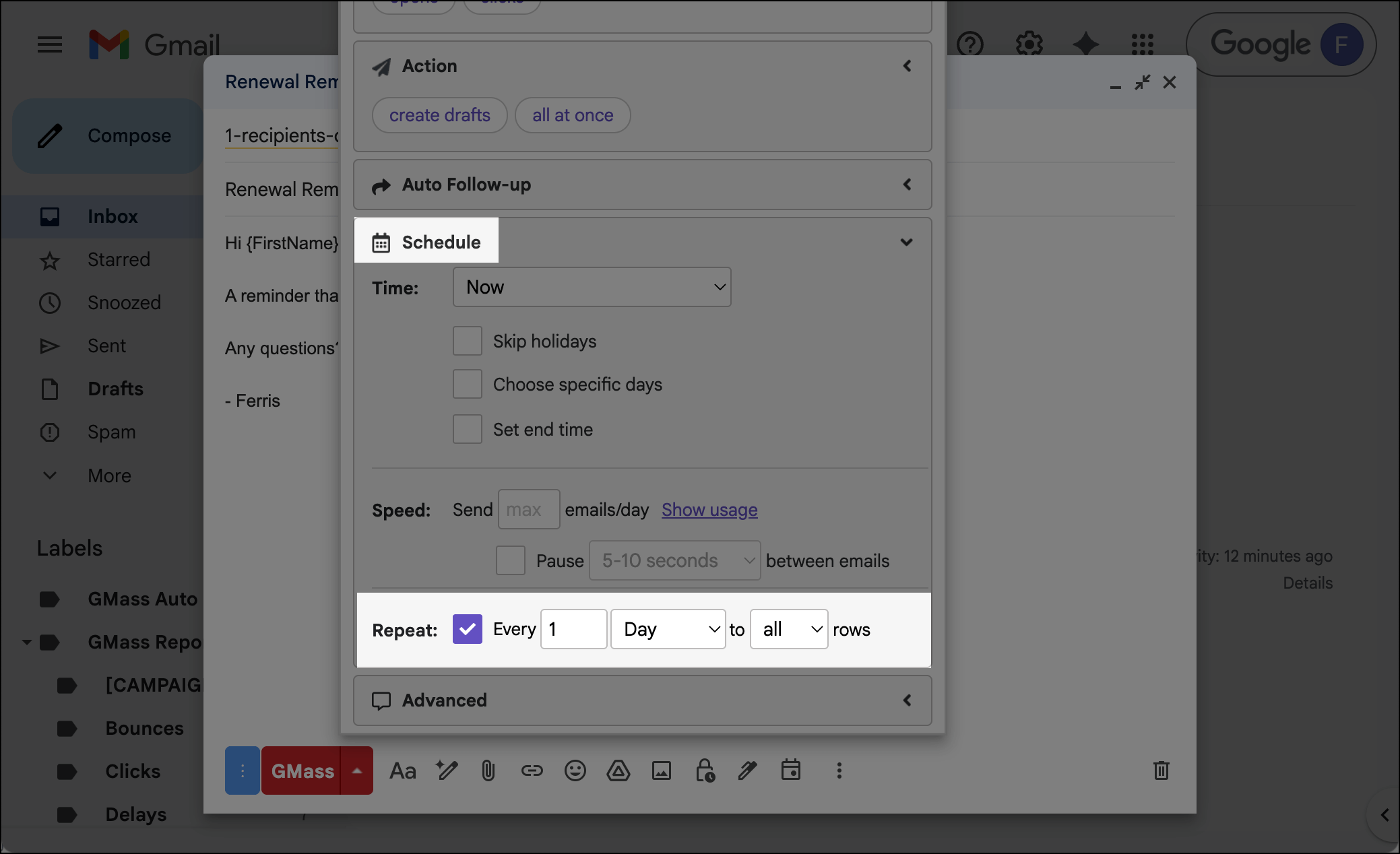 Then go to the GMass settings. In the Schedule section, set this up as a Recurring campaign at the frequency you want to send. Here, we’re sending it daily to all rows.