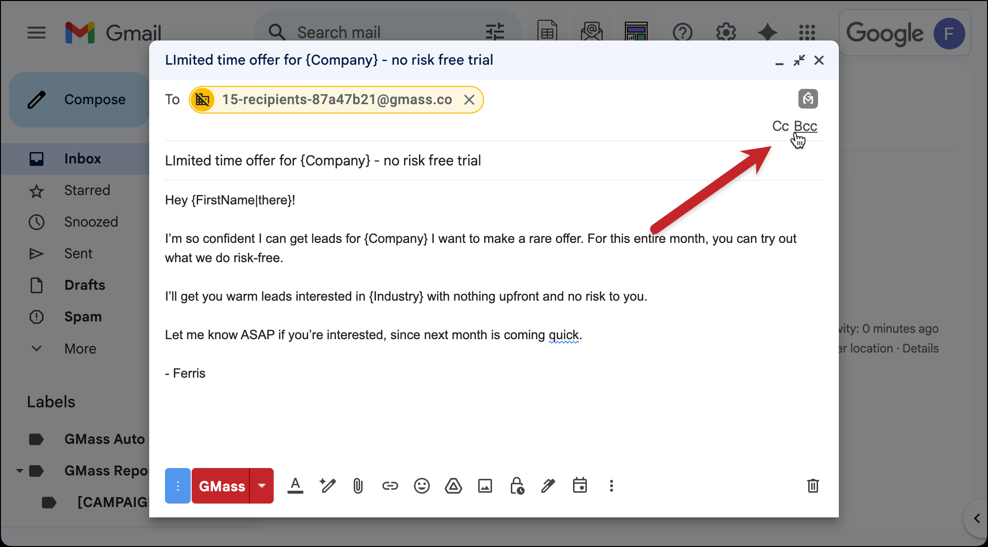 - Want to get even more sophisticated with CC and BCC in GMass? You can mail merge in specific addresses to CC or BCC for every email in a campaign.