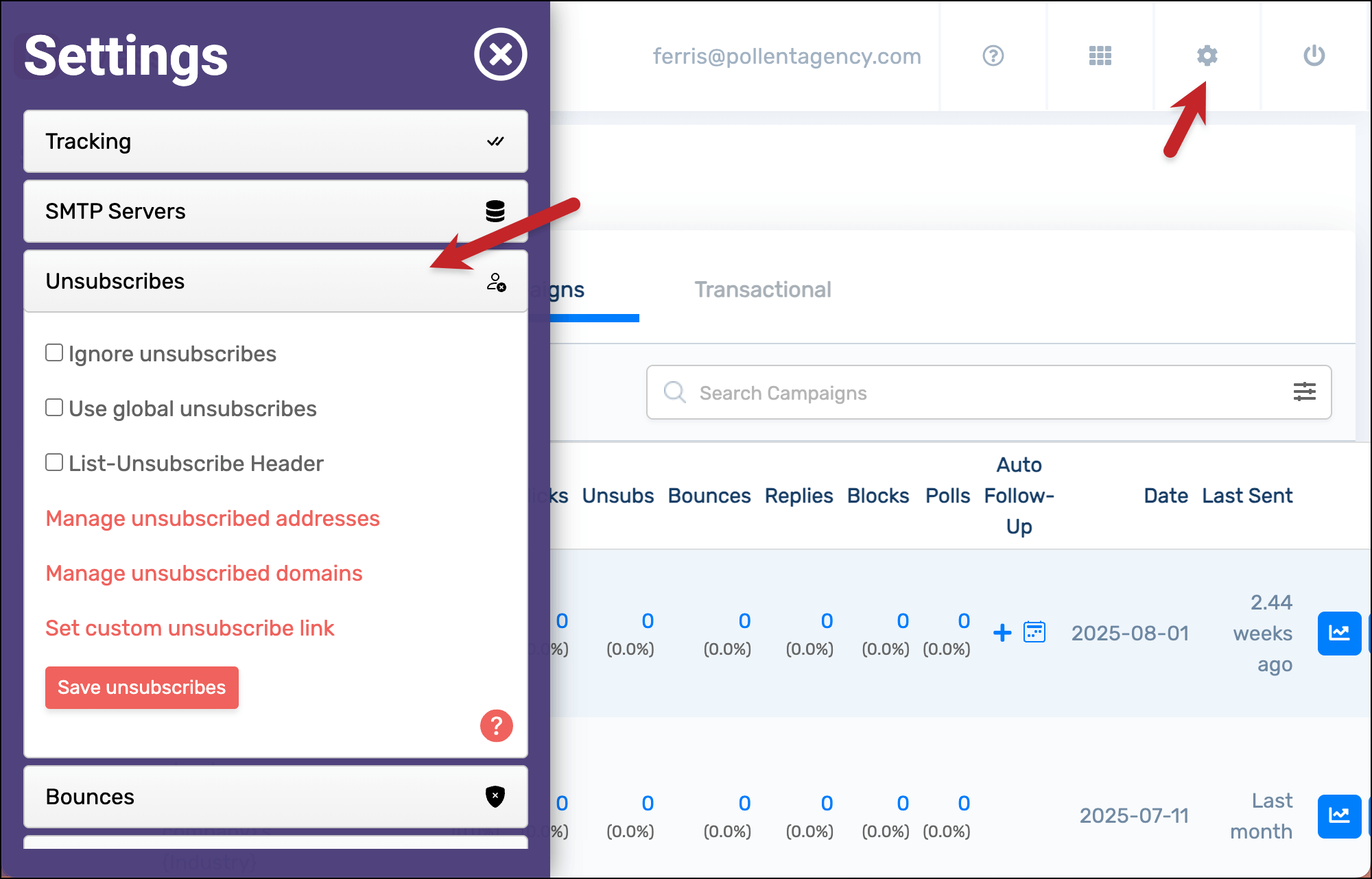 Click the gear to open the settings fly-out panel, then open the Unsubscribes section.