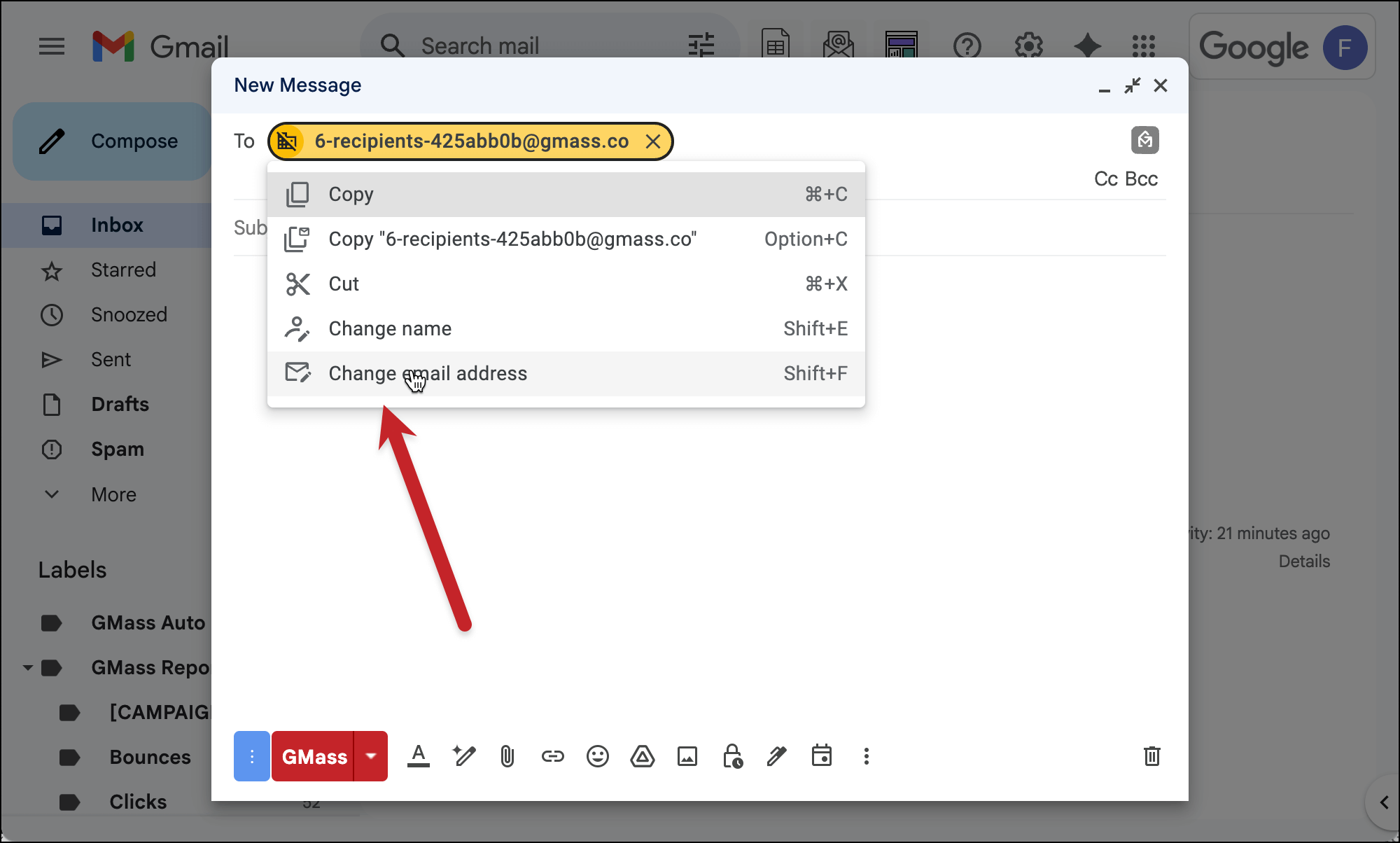 When the Gmail compose window pops up, right click on the email alias in the To field (something like 123-recipients-3241kjasd@gmass.co). Choose “Change email address” to edit the email address.