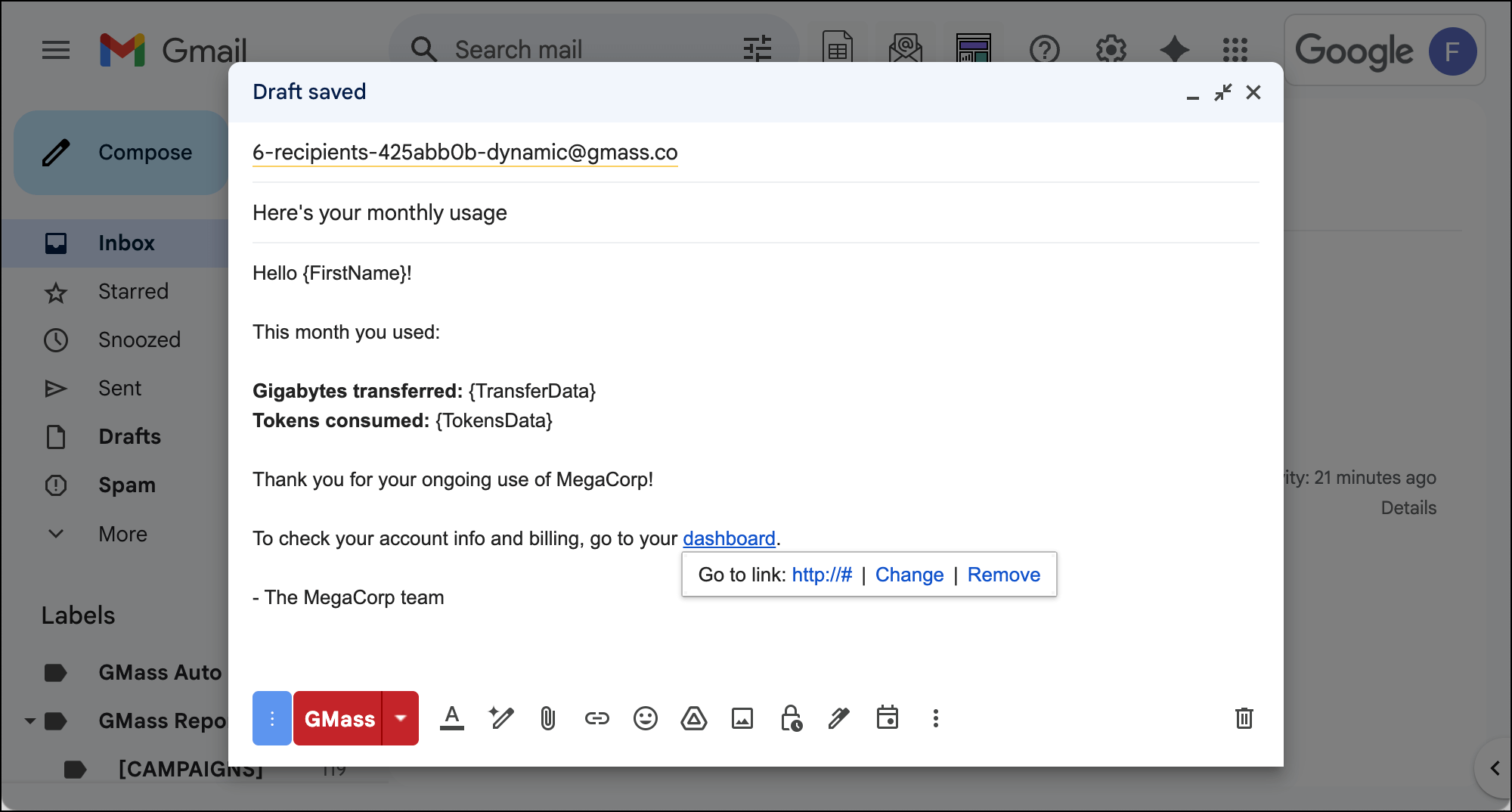 Add the word “-dynamic” right before the @ symbol. This turns your GMass campaign dynamic.