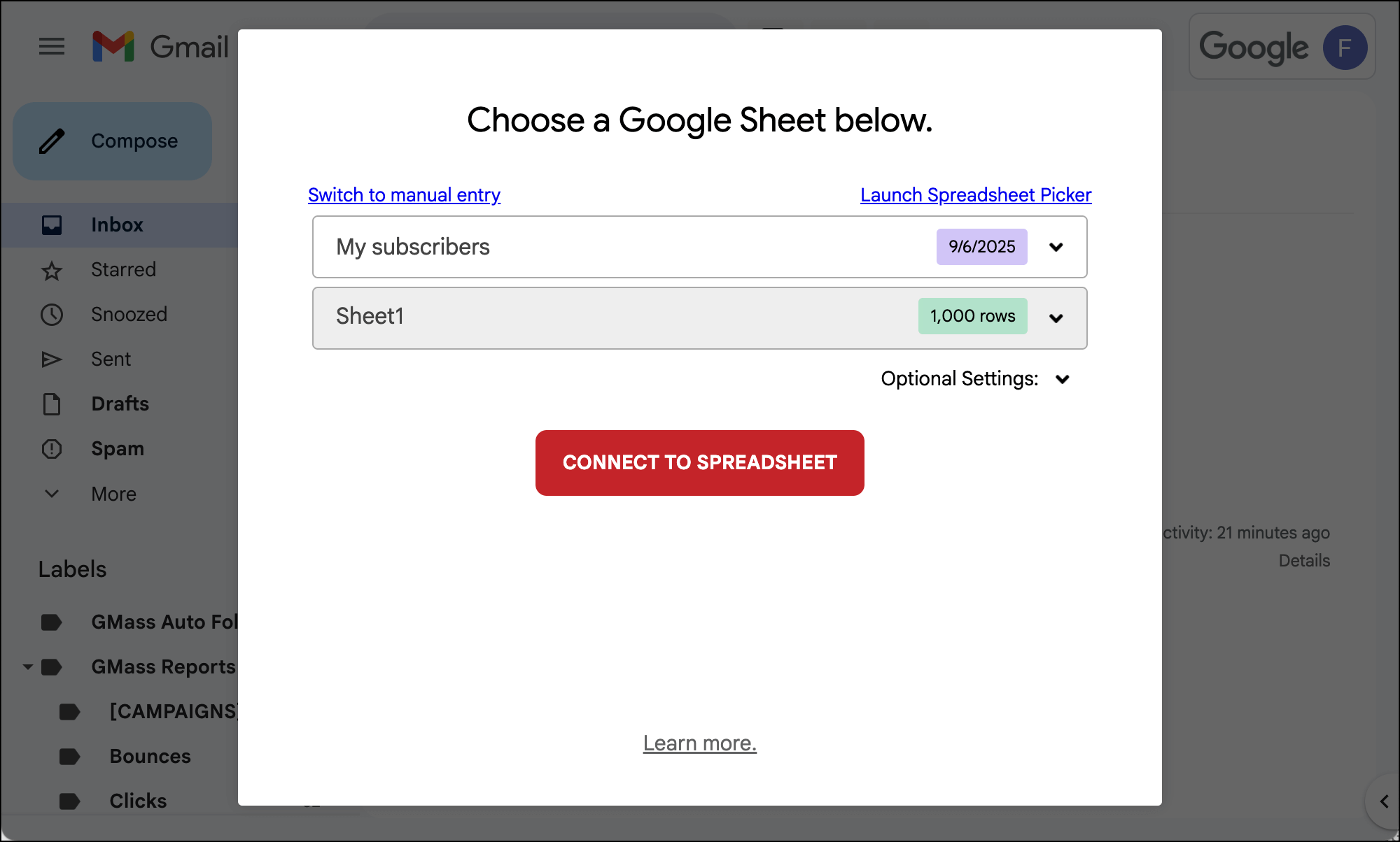 In Gmail, connect your Google Sheet of contacts to a new campaign.